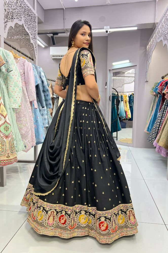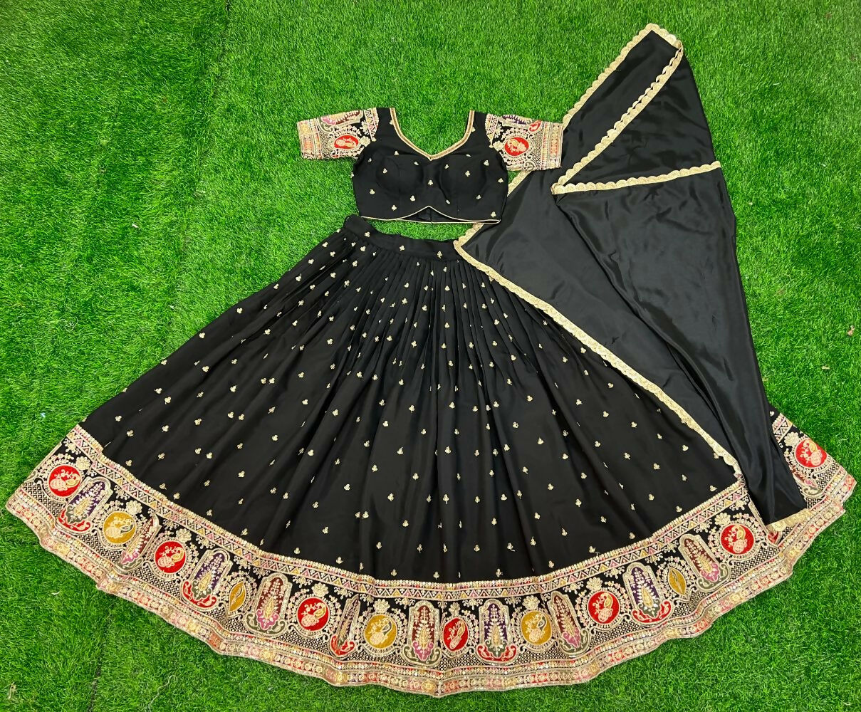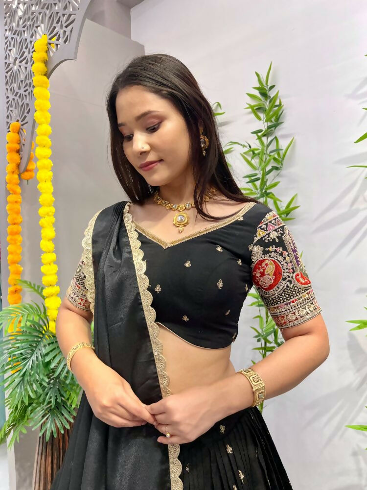 Aastha Fashion Black Roman Silk Embroidery Thread / Zari / Sequence Work Semi Stitched Wedding Wear Lehenga Choli