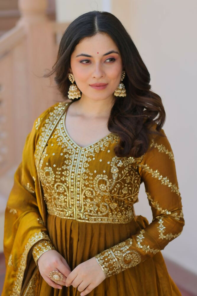 Aastha Fashion Mehandi Fendy Fabric Zari & Sequins Embroidered work Party Wear Designer Gown