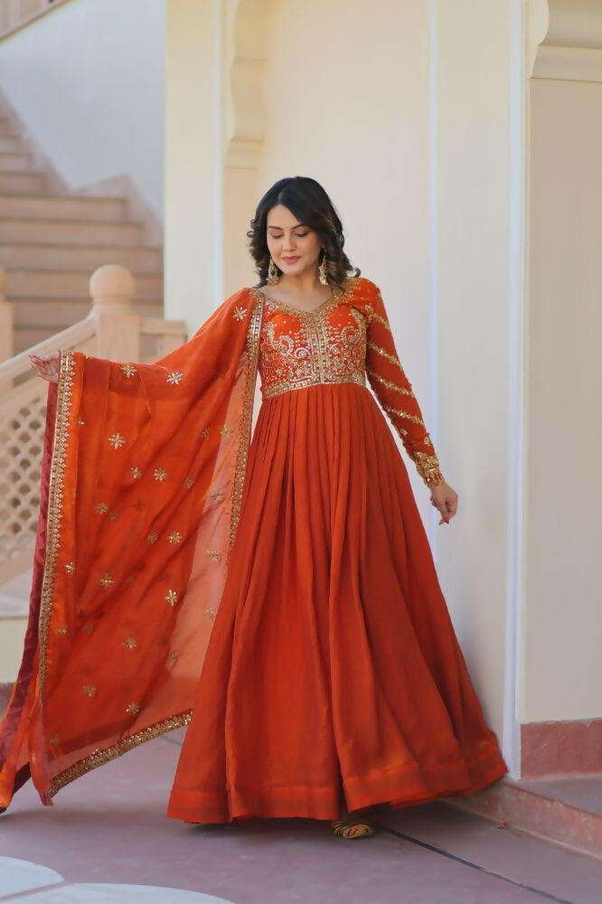 Aastha Fashion Orange Fendy Fabric Zari & Sequins Embroidered work Party Wear Designer Gown