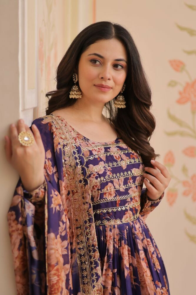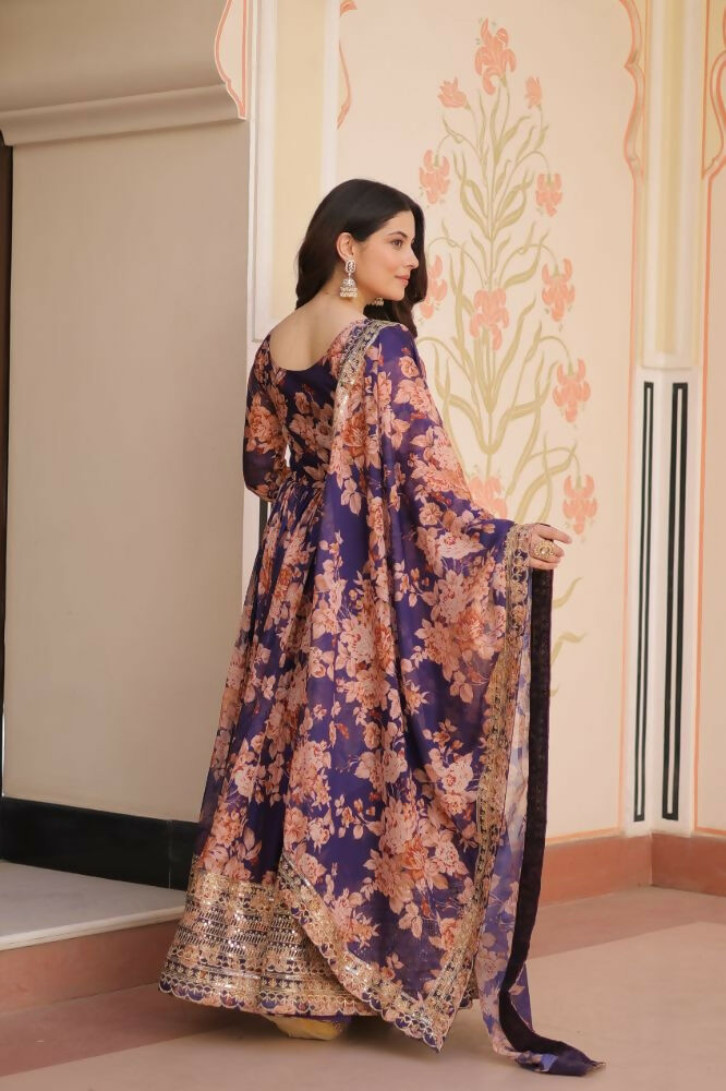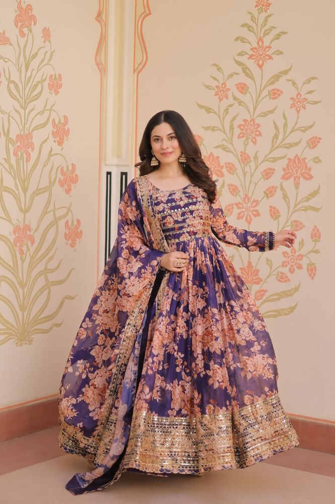 Aastha Fashion Purple Russian Silk Digital Print With Embroidered Sequins Work Party Wear Designer Gown