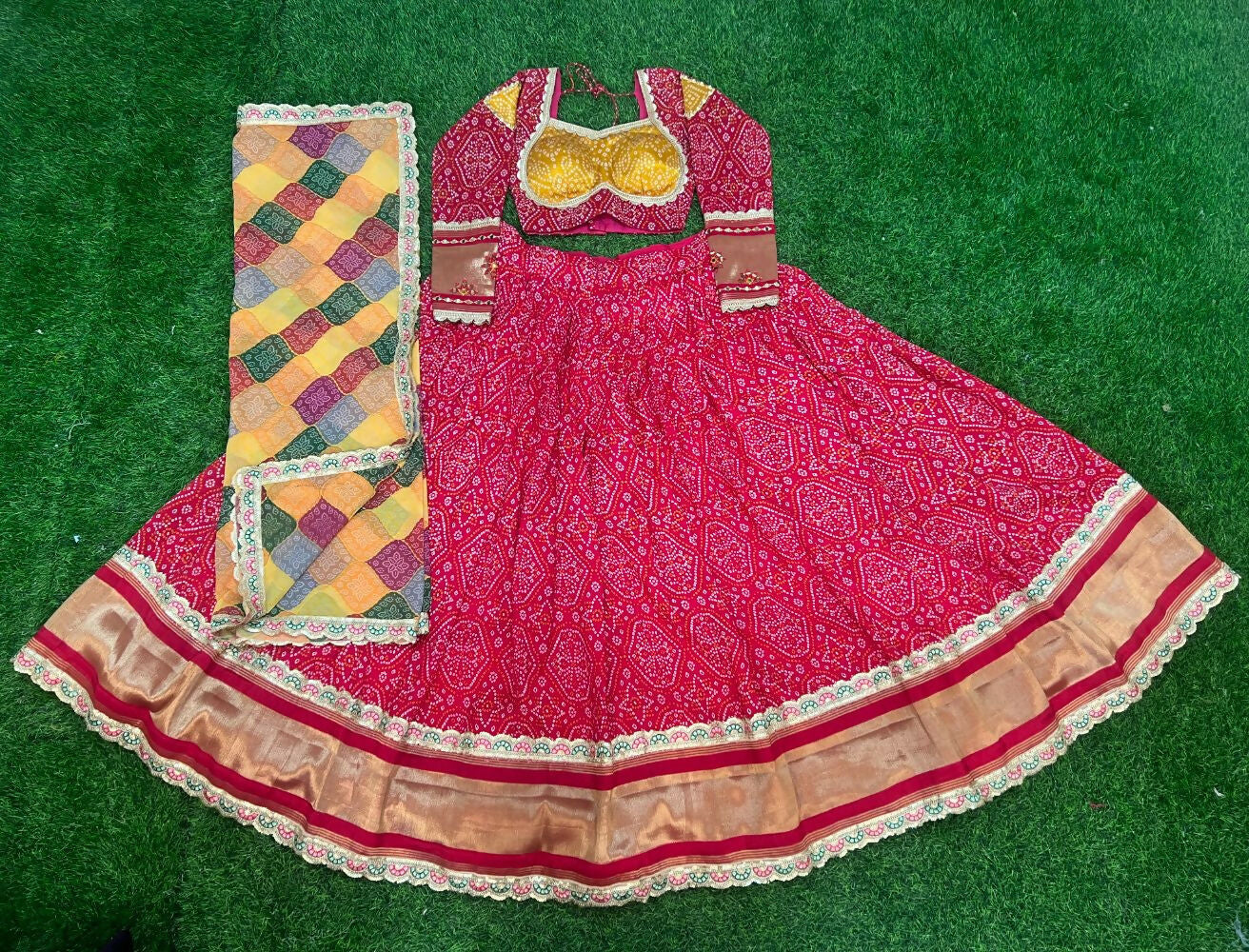Aastha Fashion Rani Gaji Soft Silk Discharge Print + Embroidery Zari / Thread / Sequence Work Lace Semi Stitched Wedding Wear Lehenga Choli