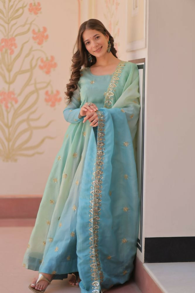 Aastha Fashion Sky Pedding Gold Organza Sequins-Multi & Zari Embroidered Work Party Wear Designer Gown