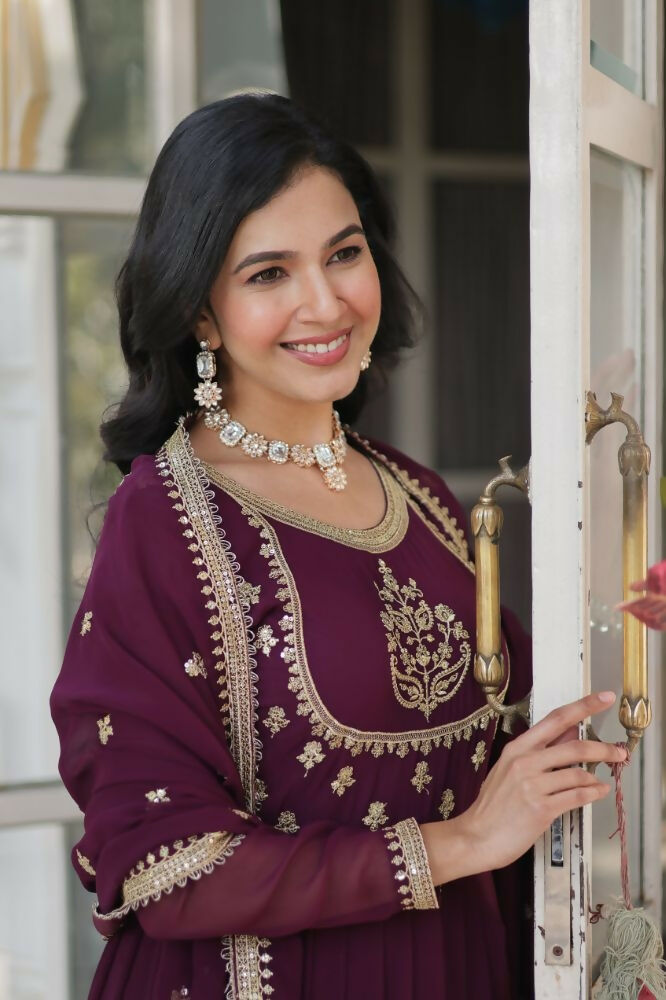Aastha Fashion Wine Faux Blooming Georgette Sequins Embroidered work Party Wear Designer Gown