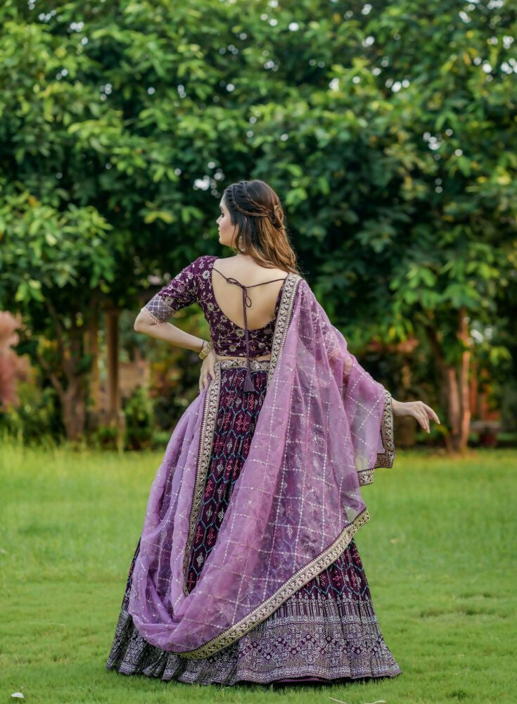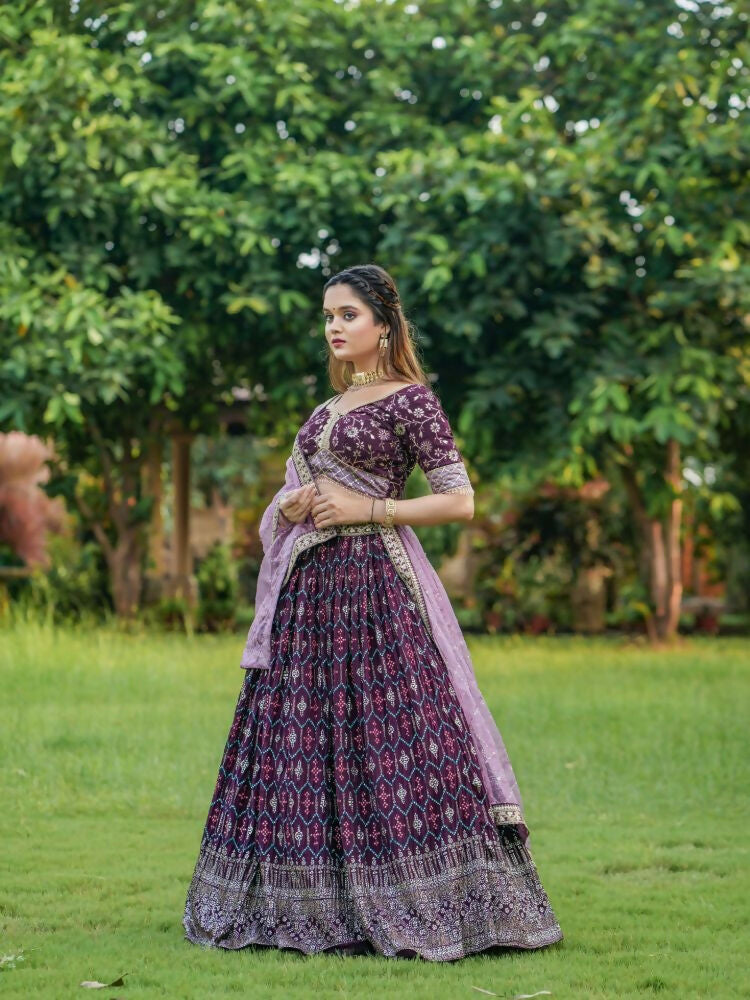 Aastha Fashion Wine Heavy Georgette Fabric Heavy Foil Print + Embroidery Work Belt Semi Stitched Wedding Wear Lehenga Choli