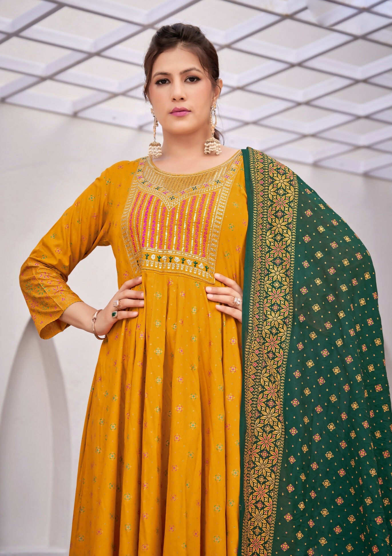 Aastha Fashion Yellow Rayon Party Wear Designer Gown Collection