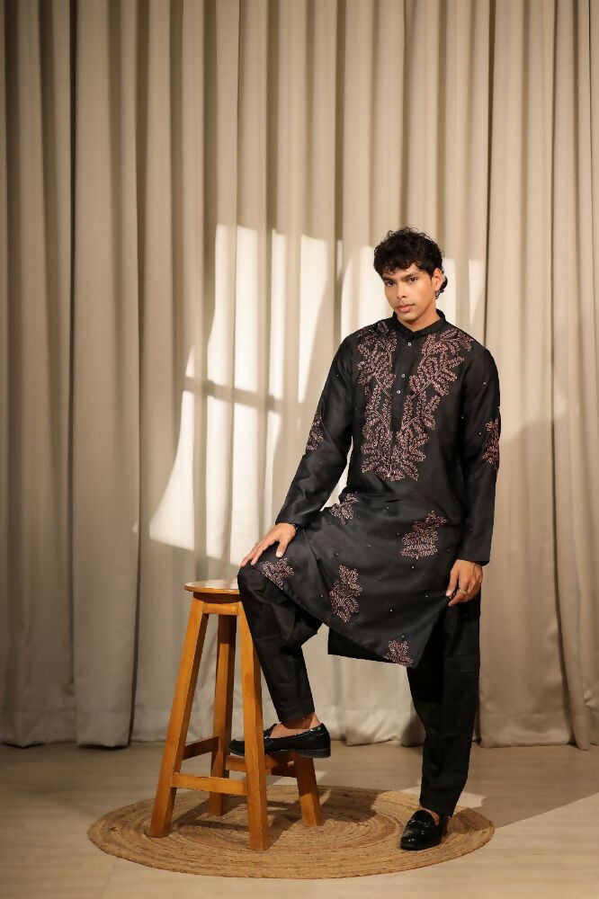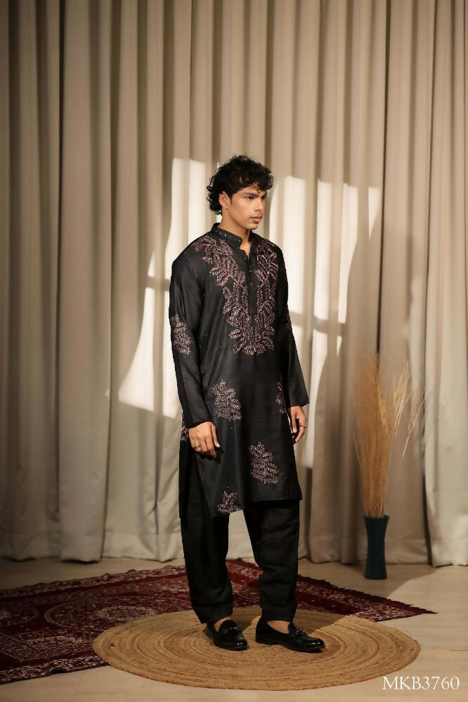 Black Greek Satin Designer Embroidery Work Kurta Set - Mahotsav