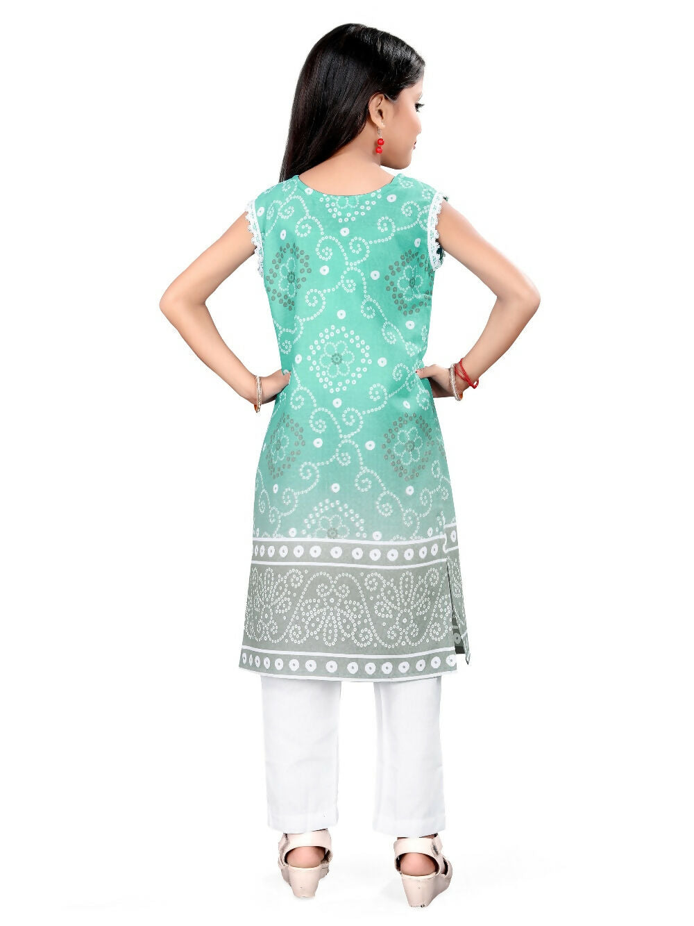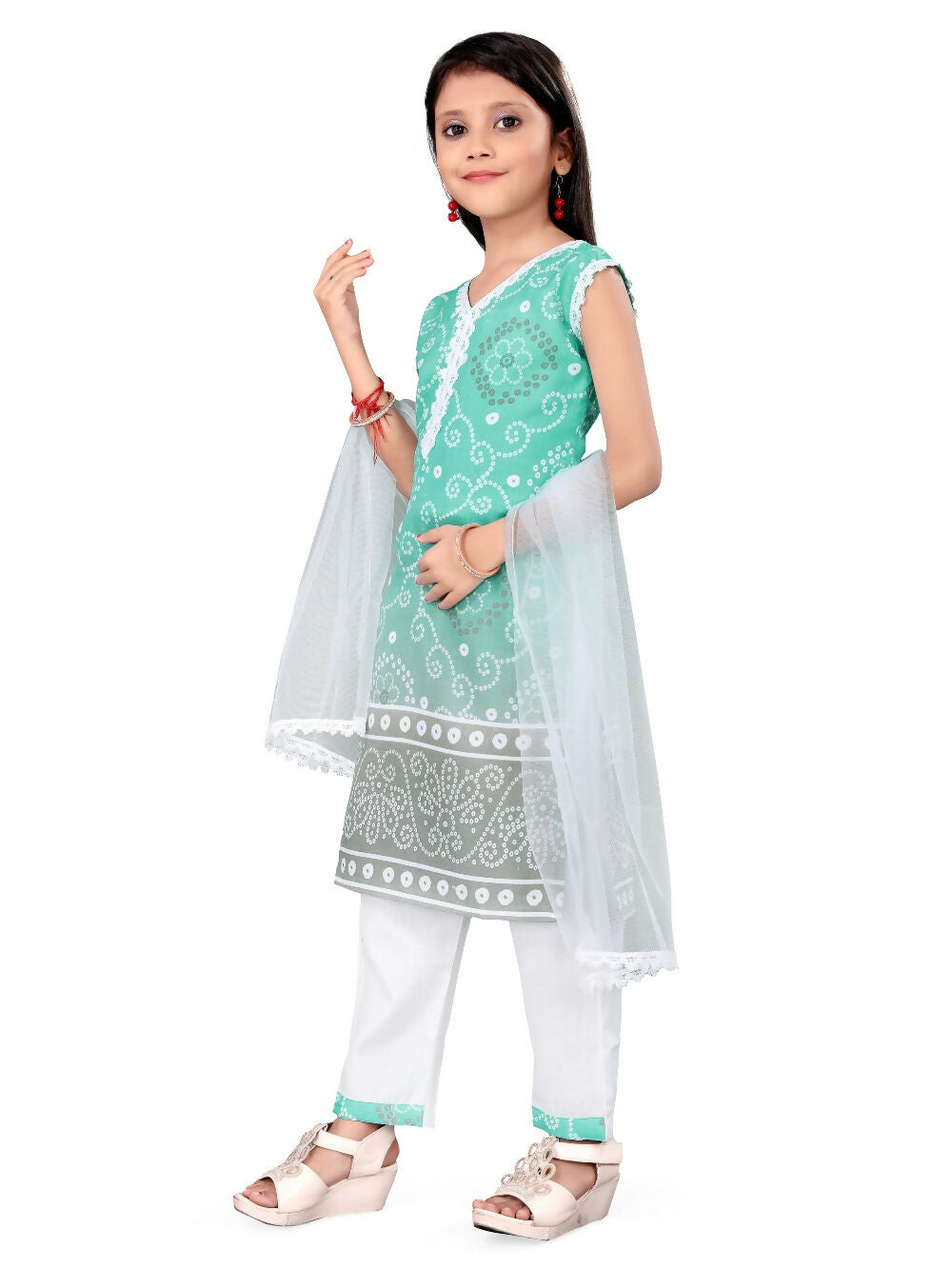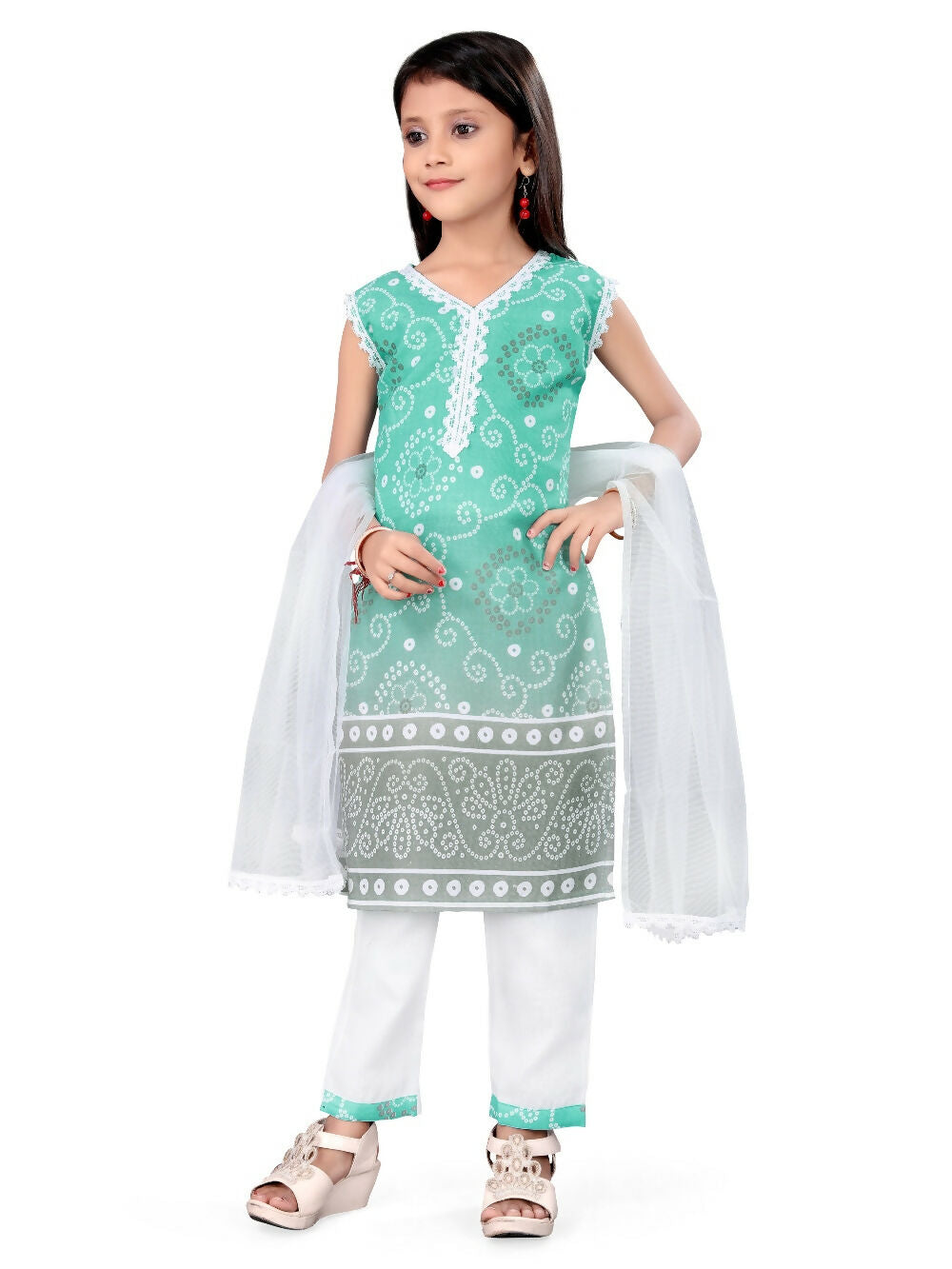 Divine Drape Girls Cotton Green Printed Straight Kids Kurta Pant With Dupatta