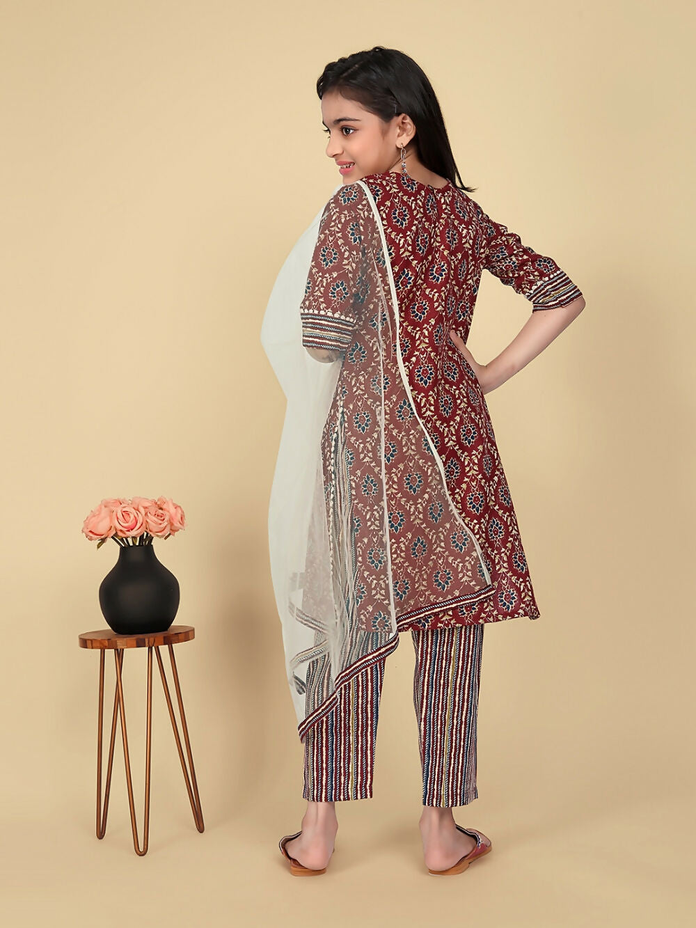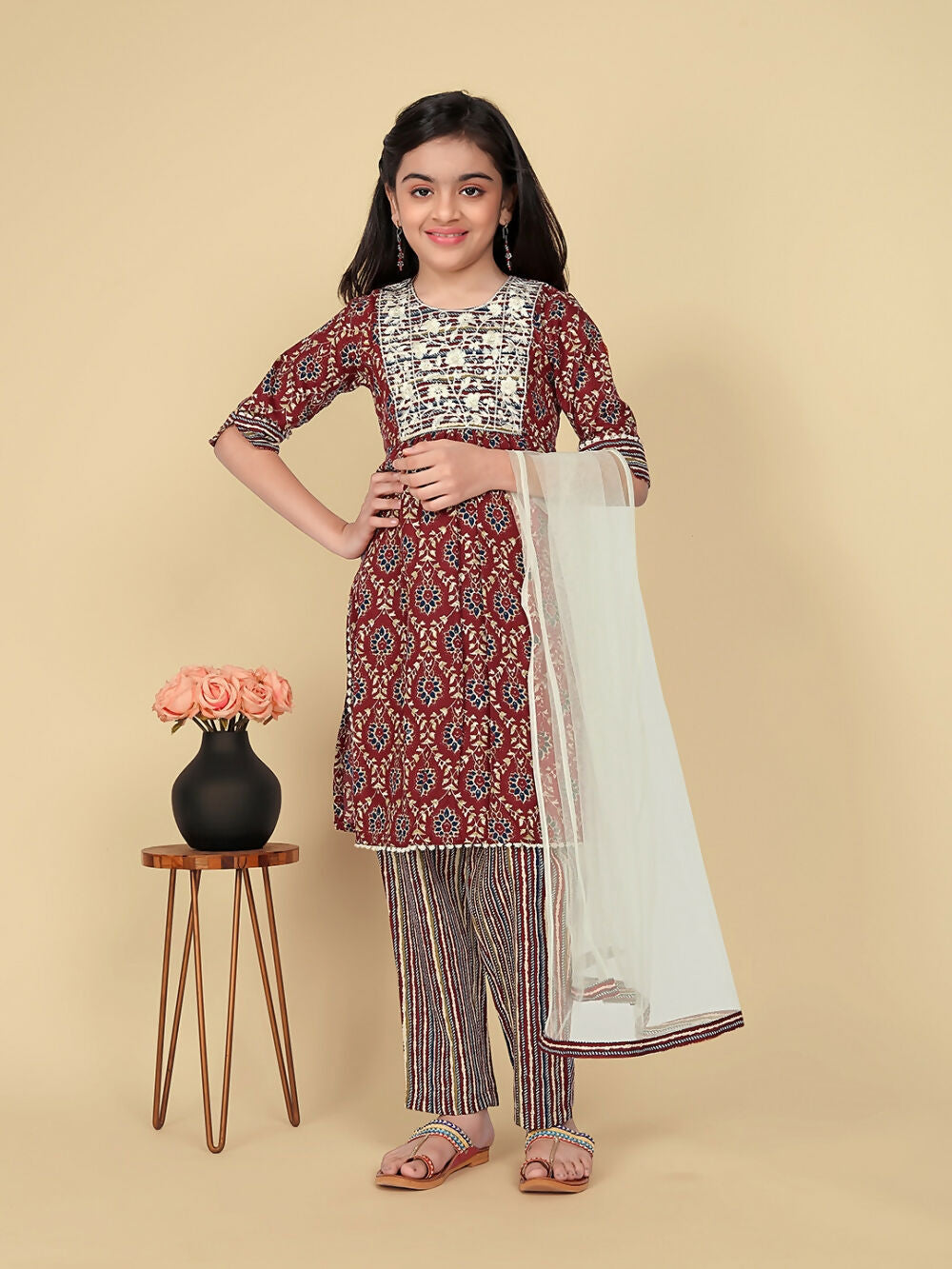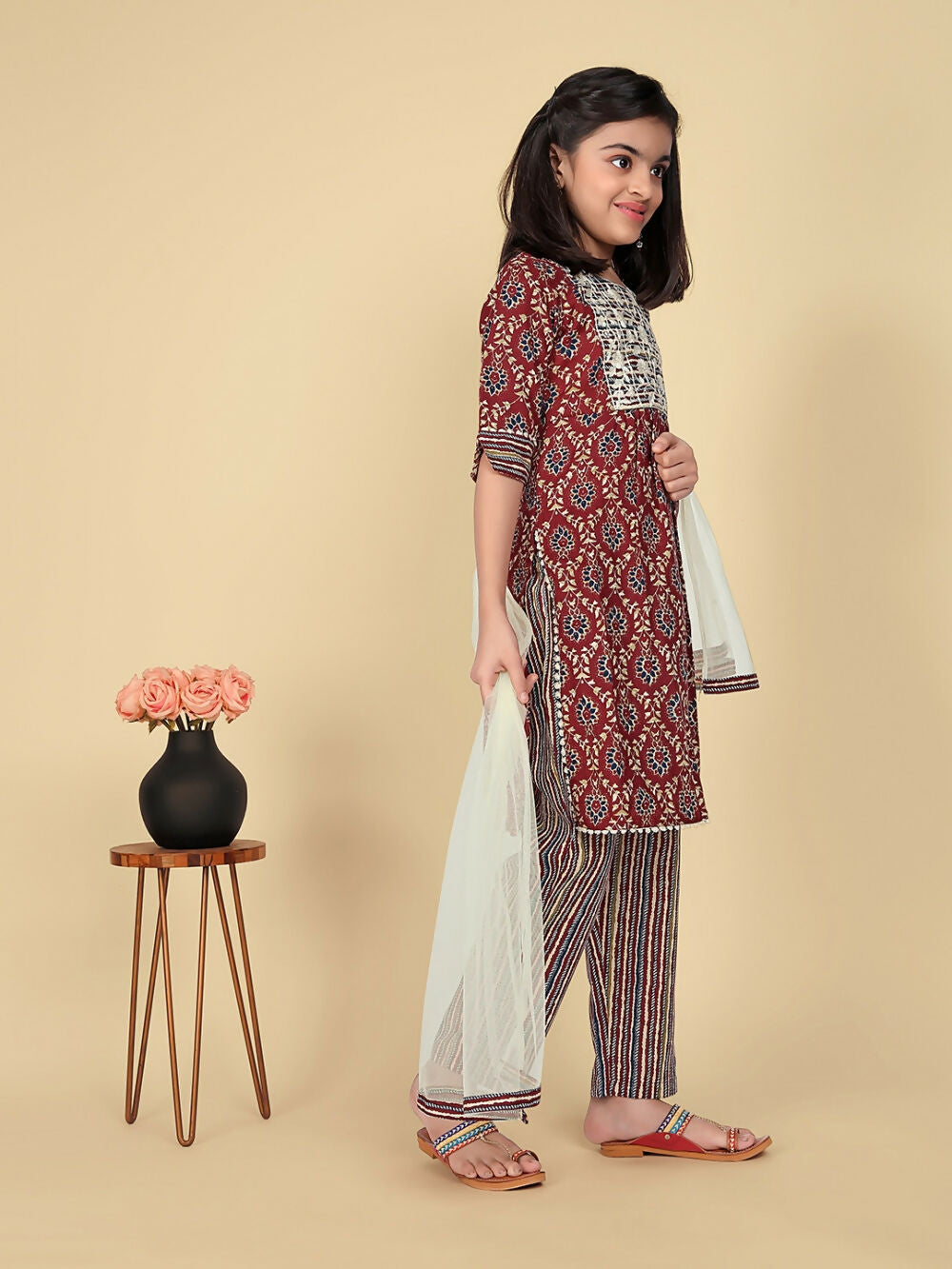 Divine Drape Girls Poly Cotton Maroon Embroidered Straight Kids Kurta Pant With Dupatta