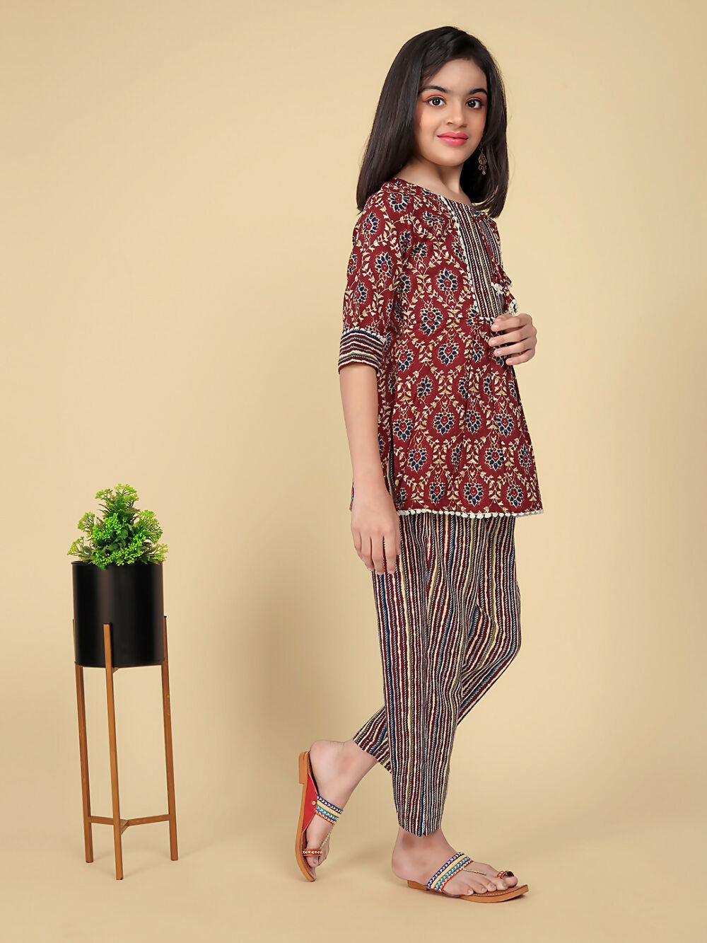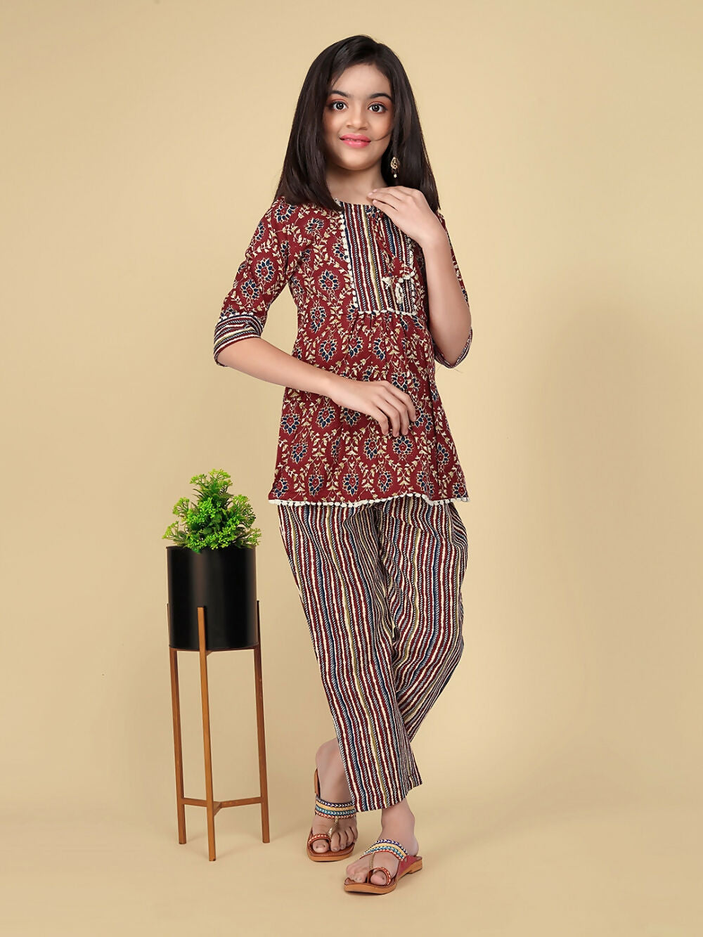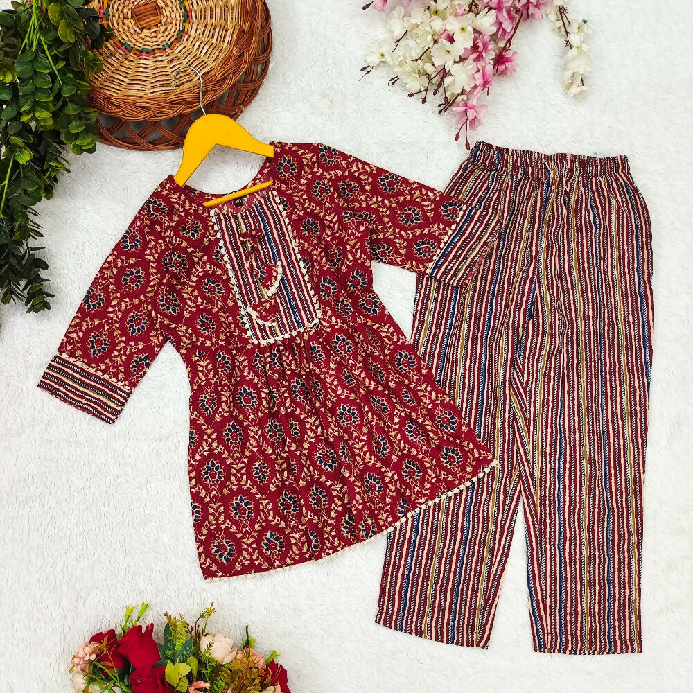 Divine Drape Girls Poly Cotton Maroon Printed Straight Kids Kurta Pant Set