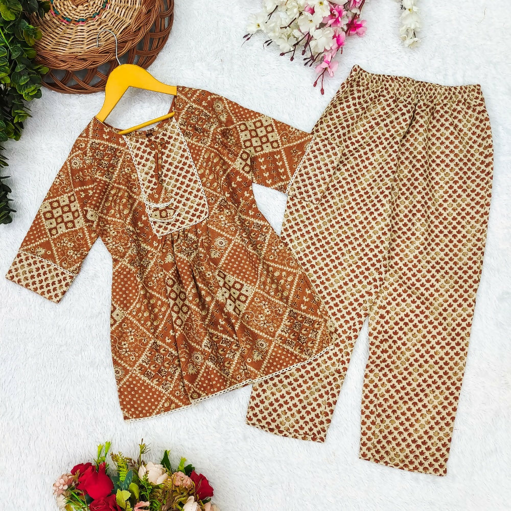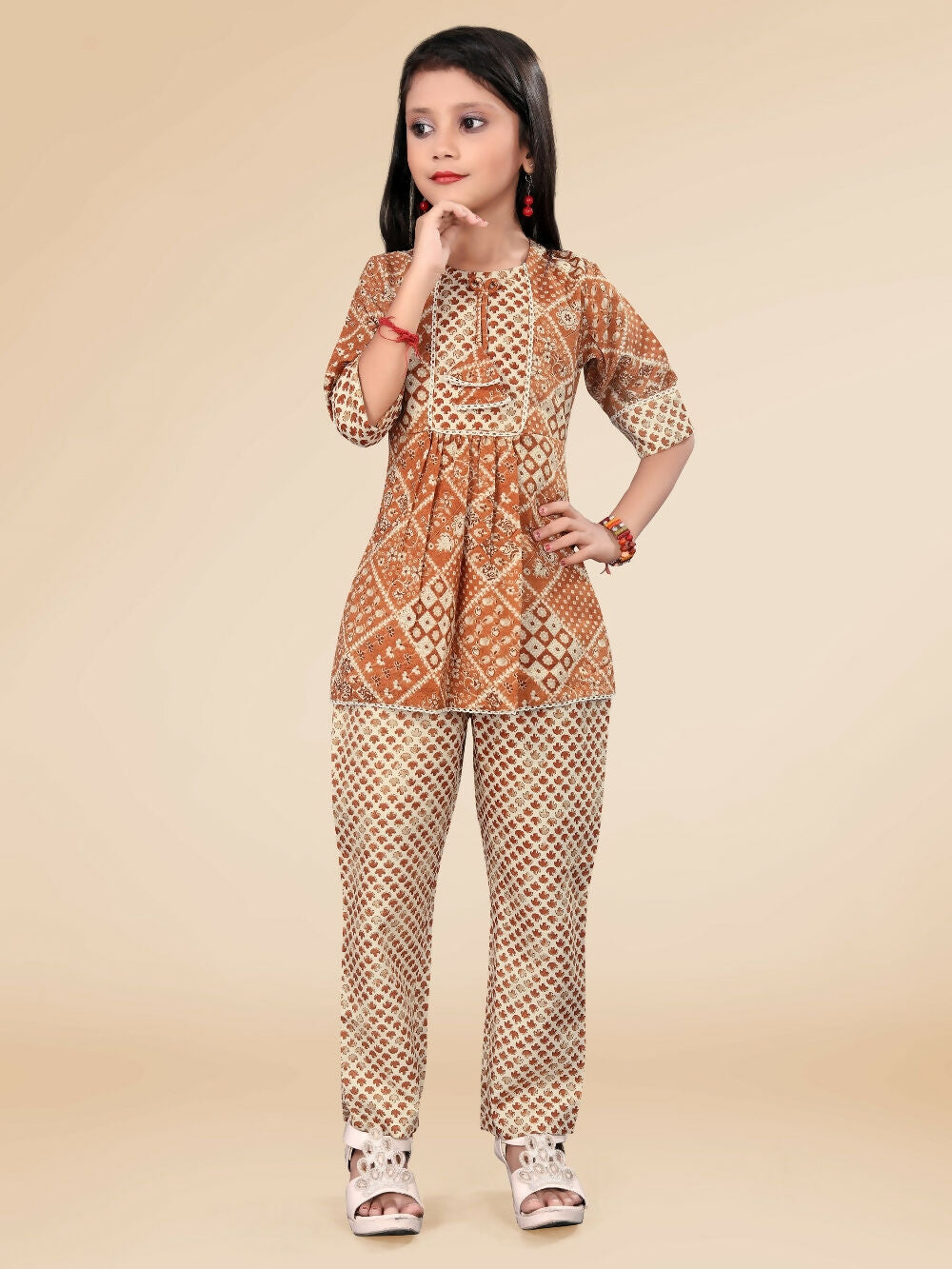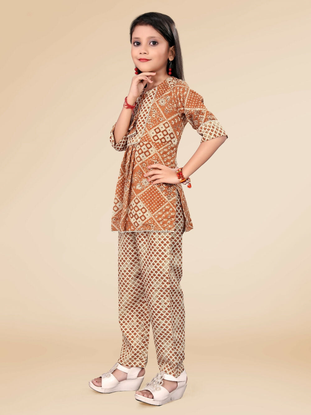 Divine Drape Girls Poly Cotton Mustard Printed Straight Kids Kurta Pant Set