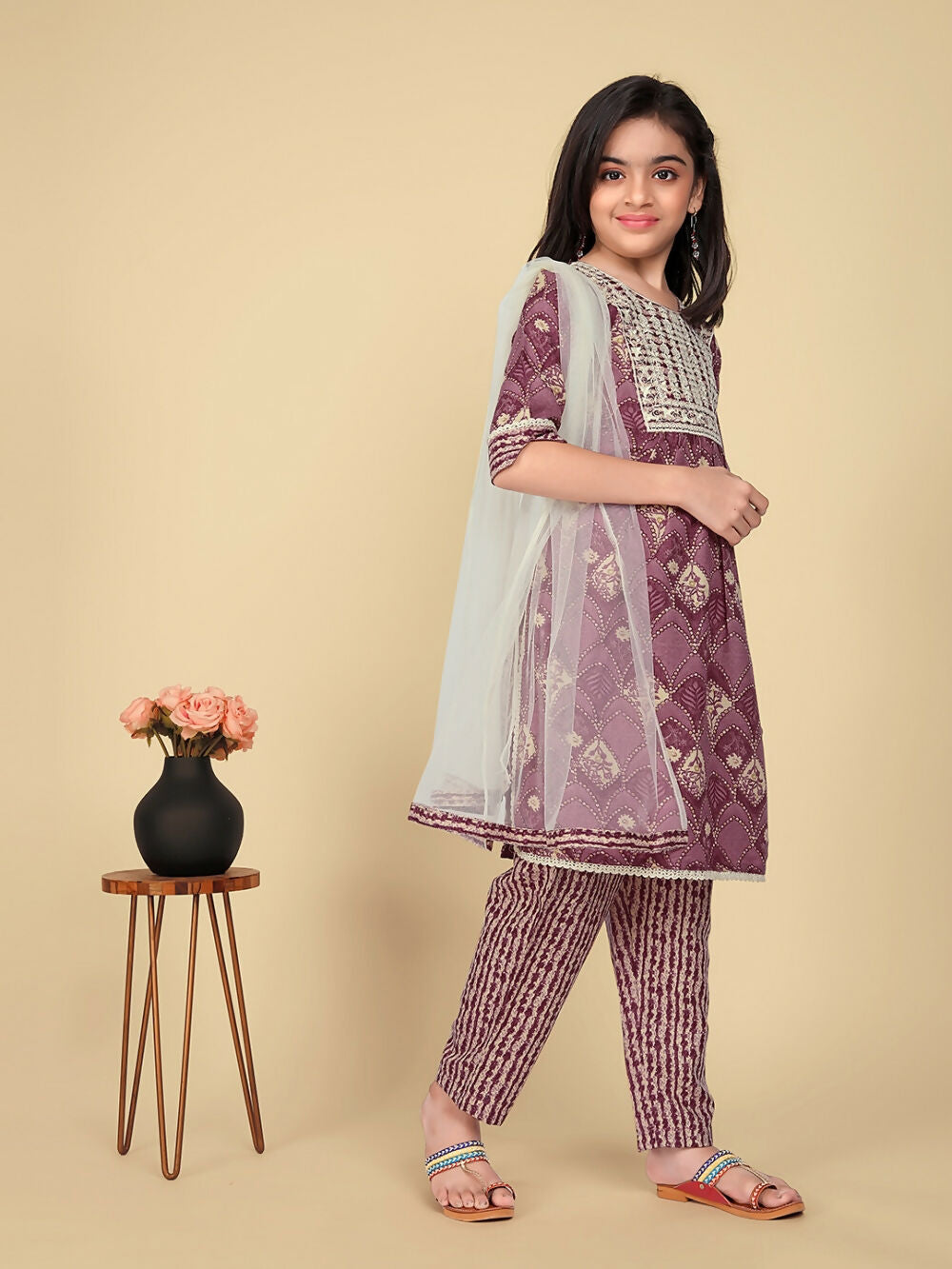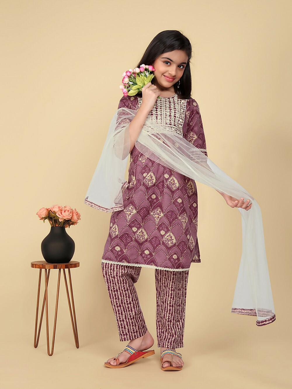 Divine Drape Girls Poly Cotton Purple Embroidered Straight Kids Kurta Pant With Dupatta
