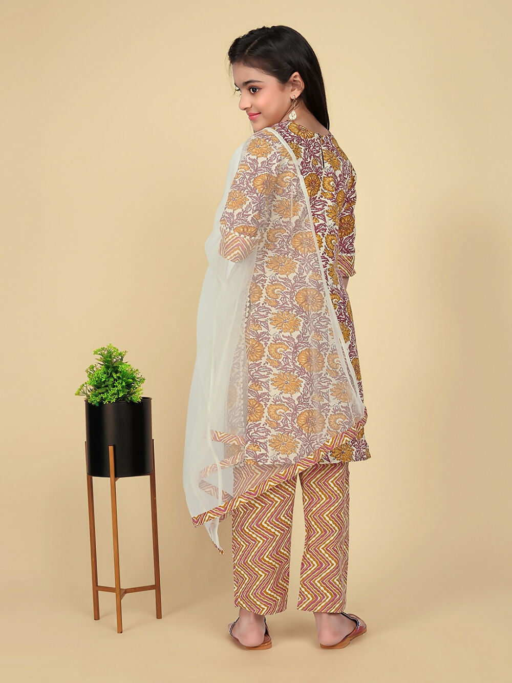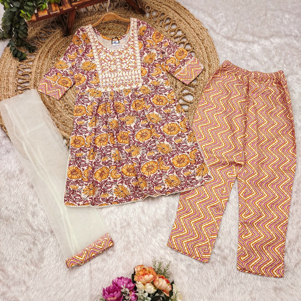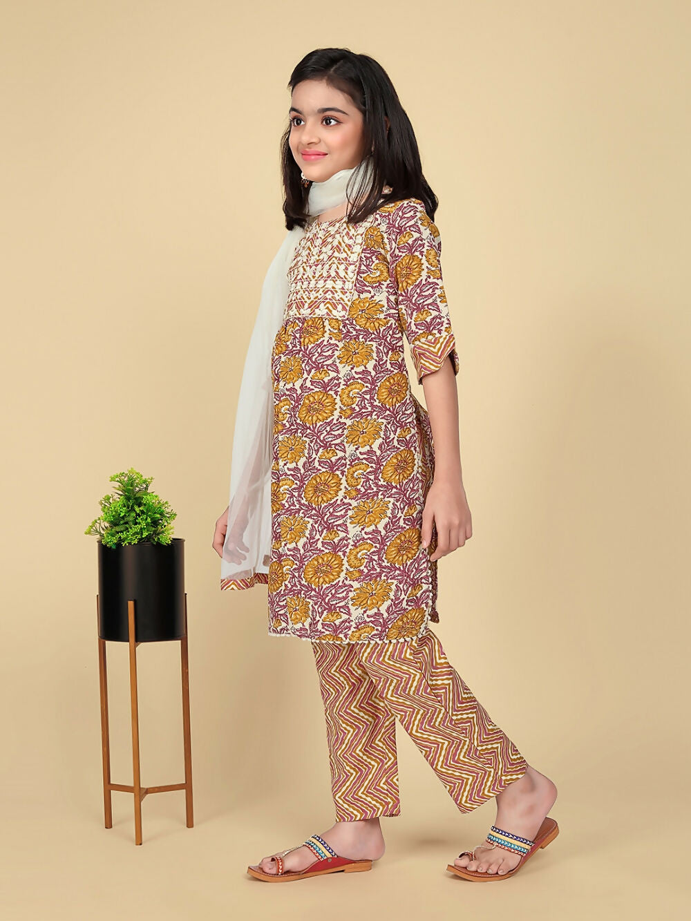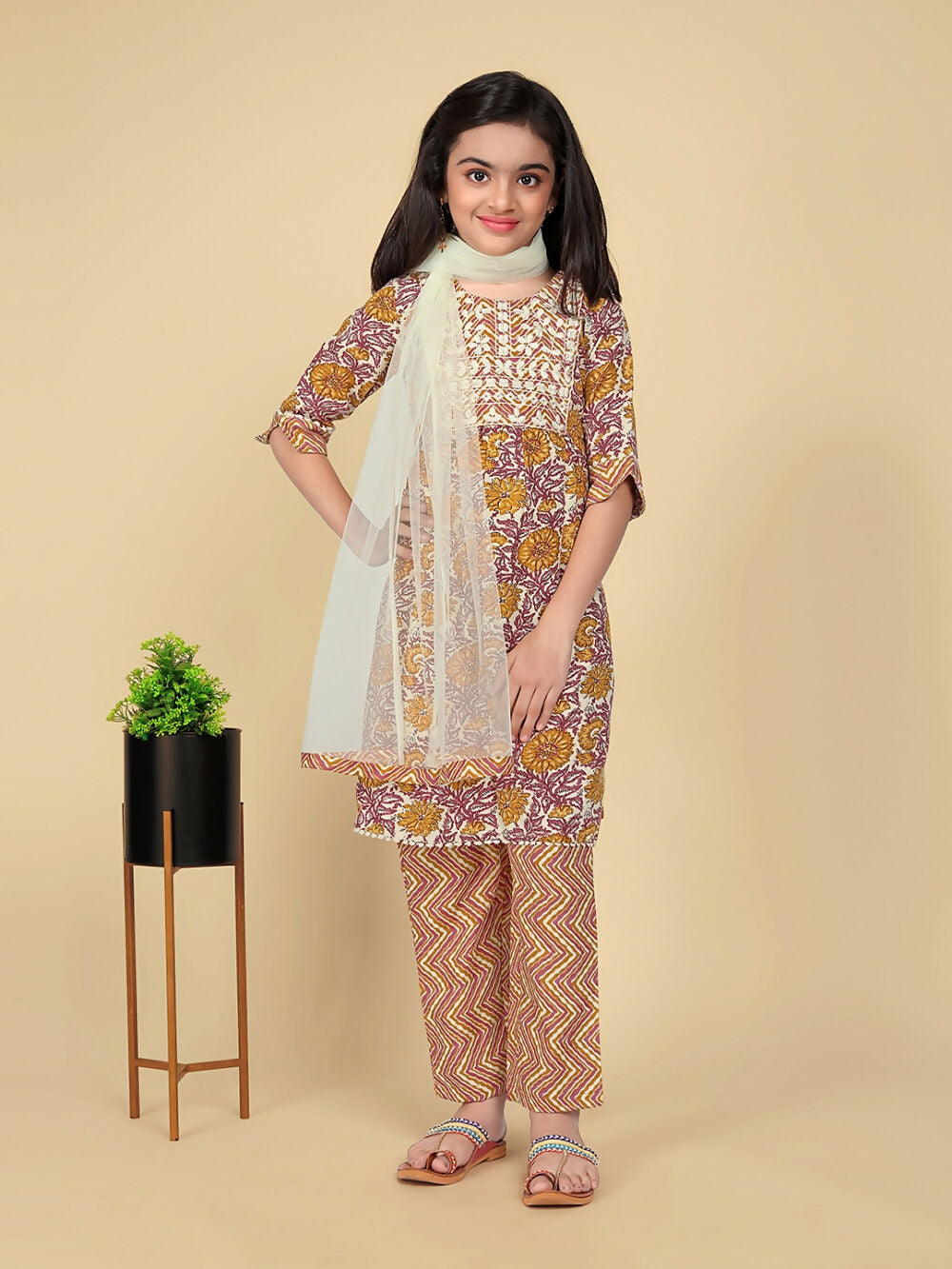 Divine Drape Girls Poly Cotton Yellow Embroidered Straight Kids Kurta Pant With Dupatta