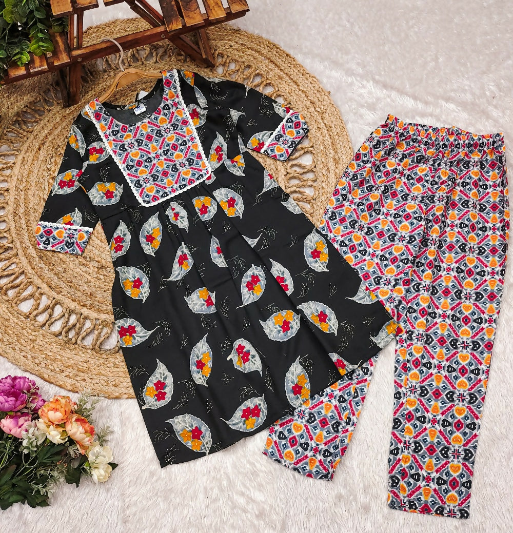 Divine Drape Girls Rayon Black Printed Straight Kids Kurta Set