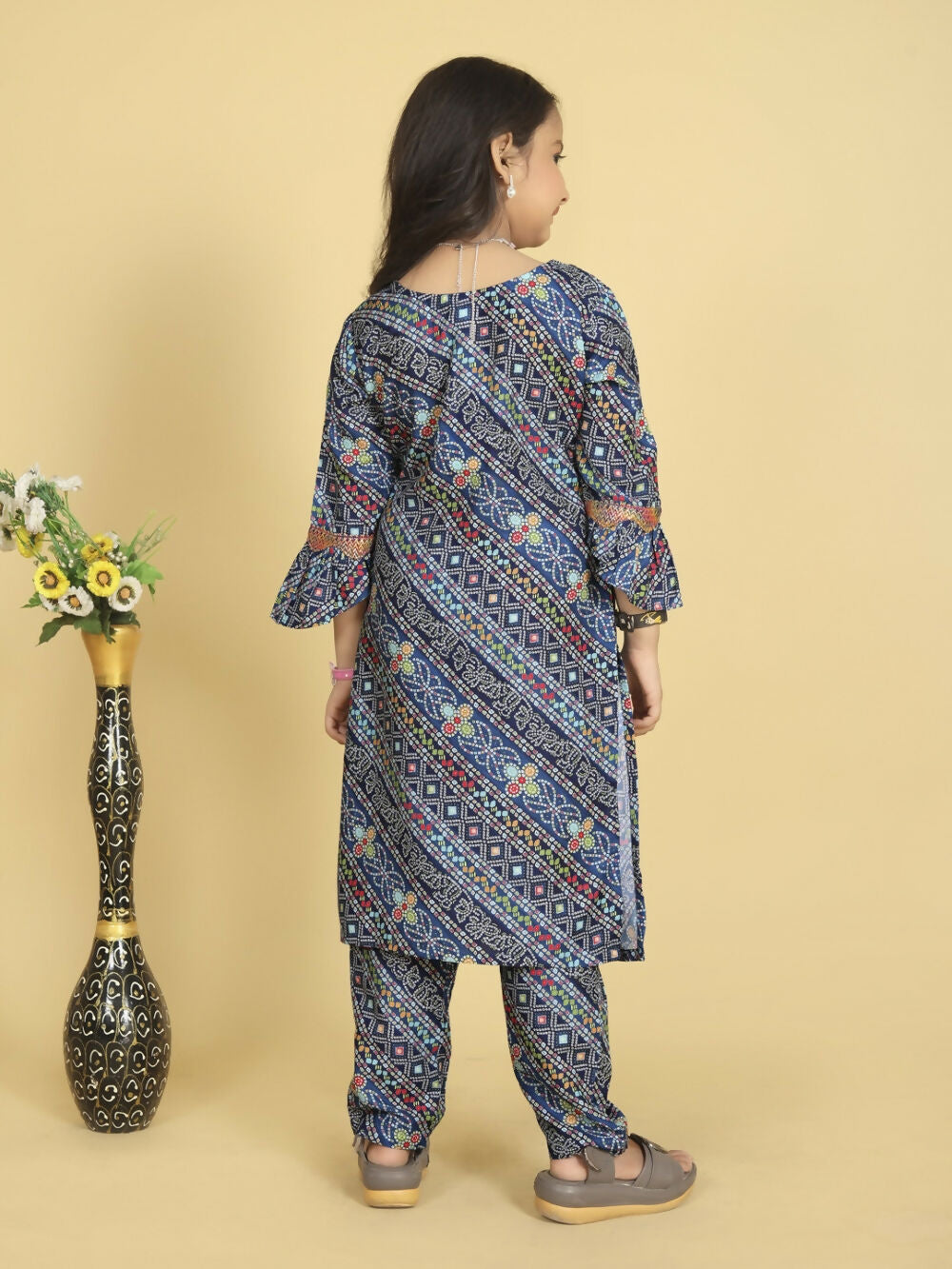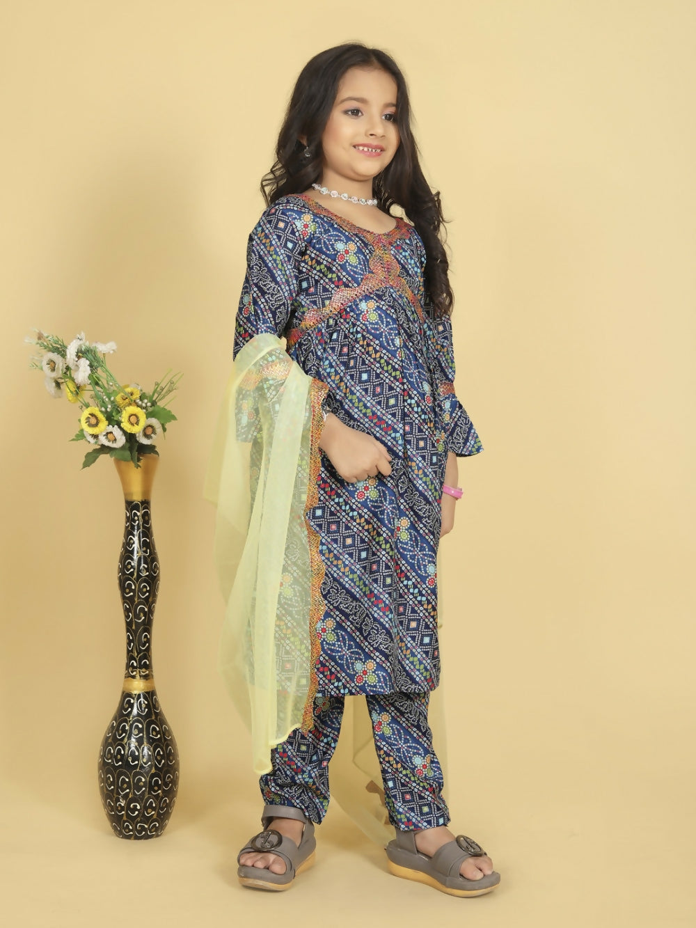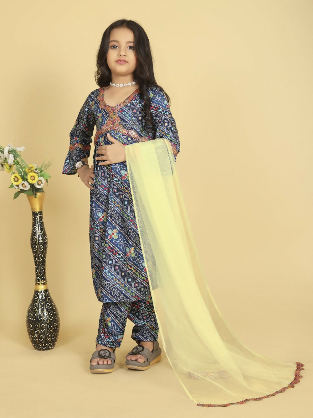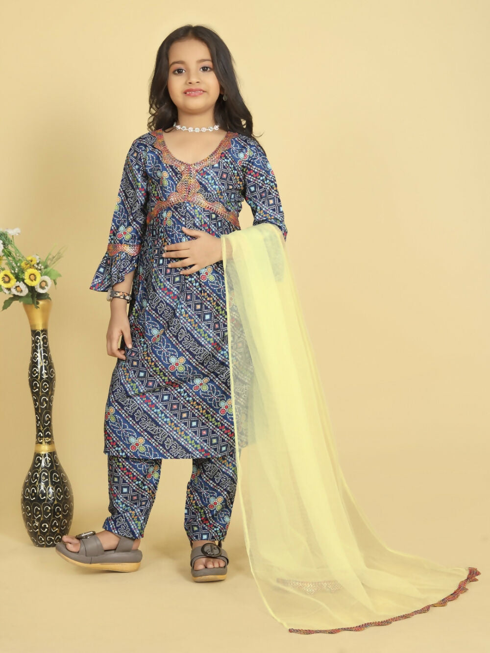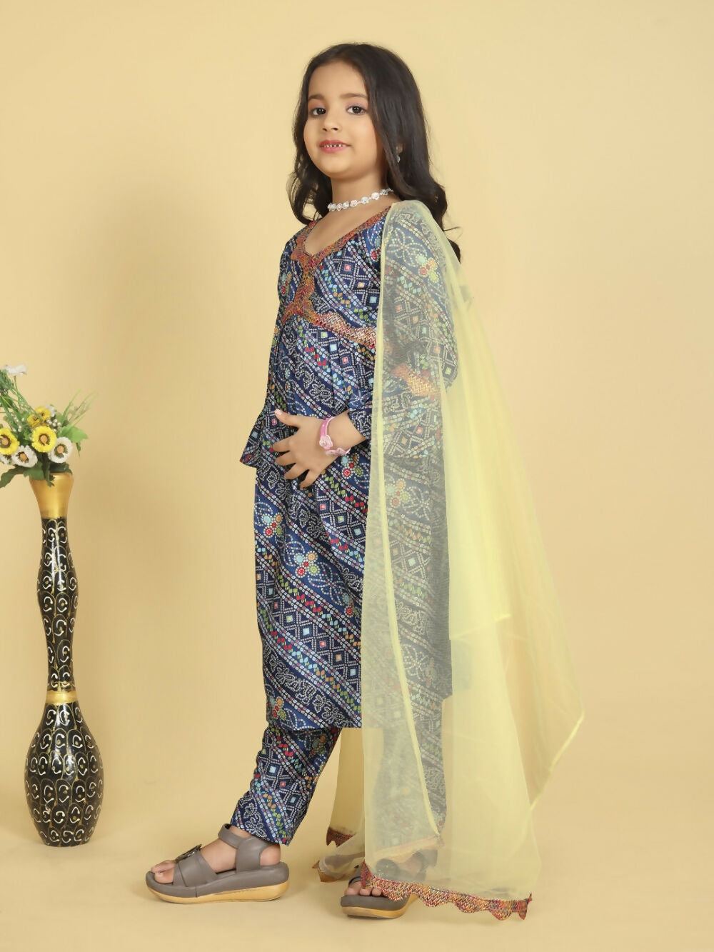 Divine Drape Girls Roman Slub Blue Printed Straight Kids Kurta Pant With Dupatta