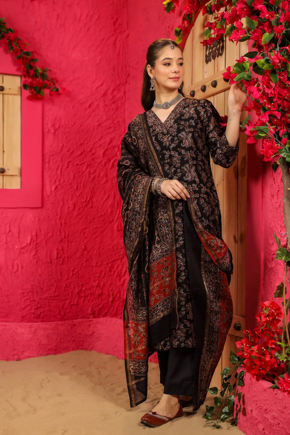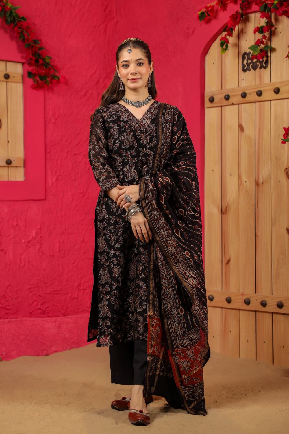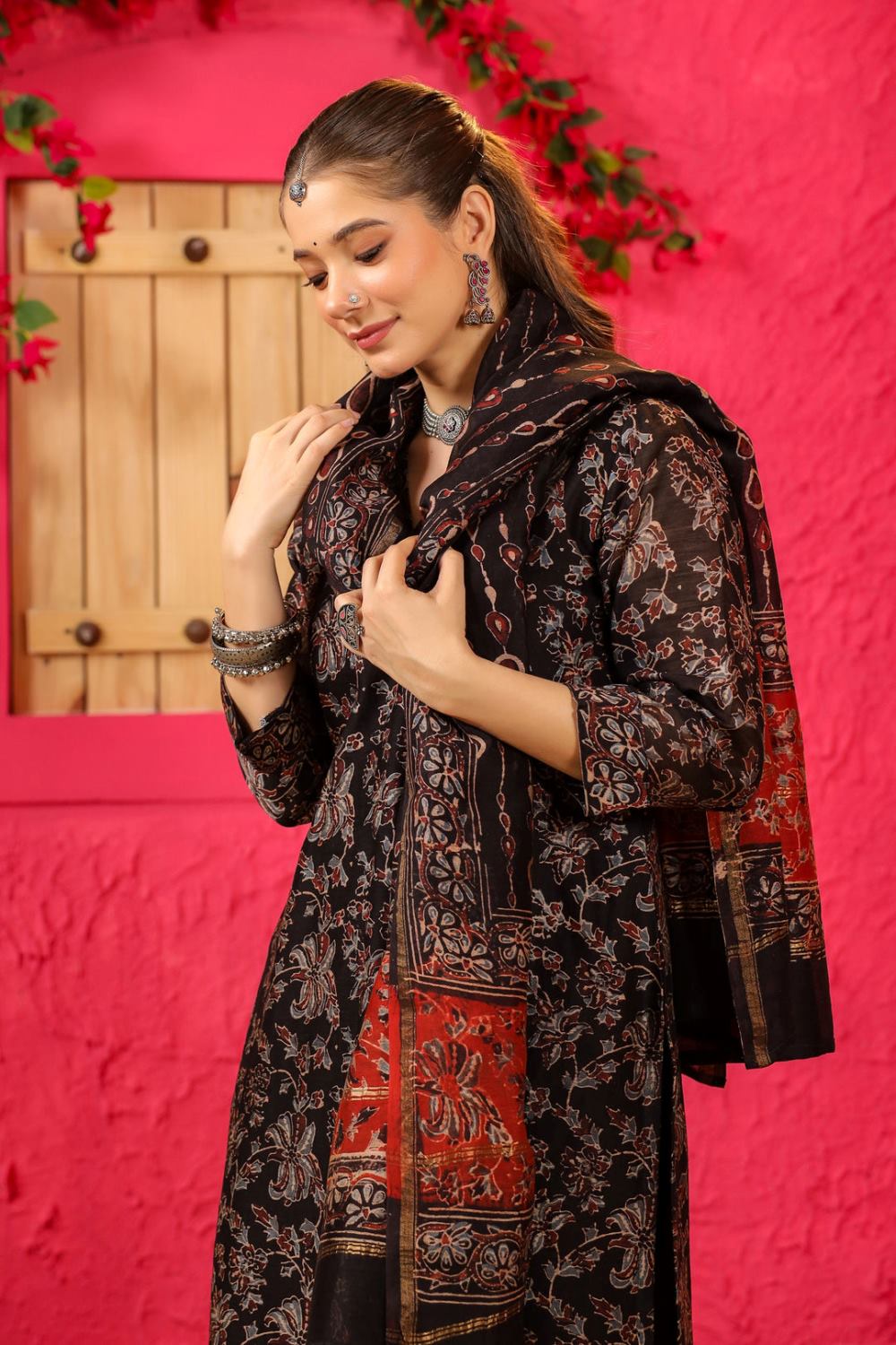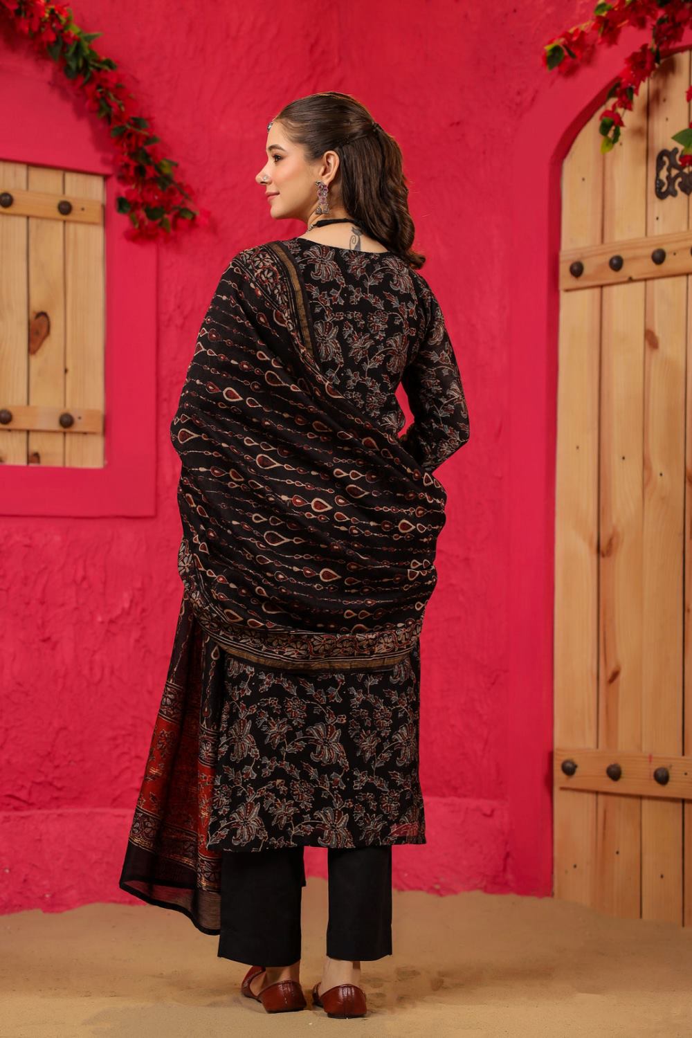 Divine Drape Women's Roman Slub Printed Straight Kurta Pant With Dupatta - Black