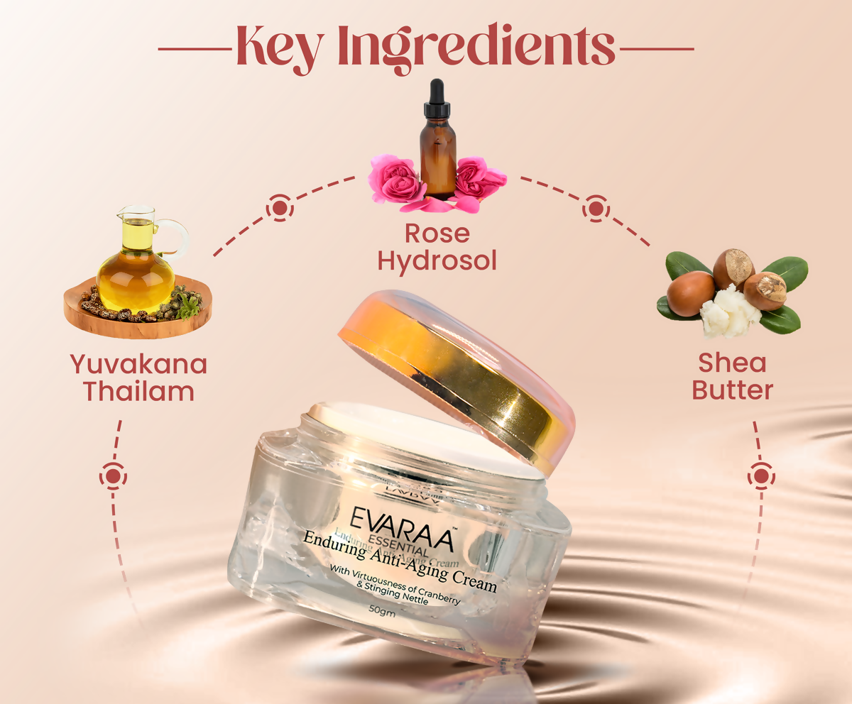 Evaraa Essential Enduring Cream is a lightweight skincare formulation crafted with Shea Butter, Cocoa Butter, Kokum Butter, Mango Butter, Aloe Vera, and botanical oils. Inspired by Ayurvedic traditions, it blends natural butters and extracts in a cream designed for everyday use.
