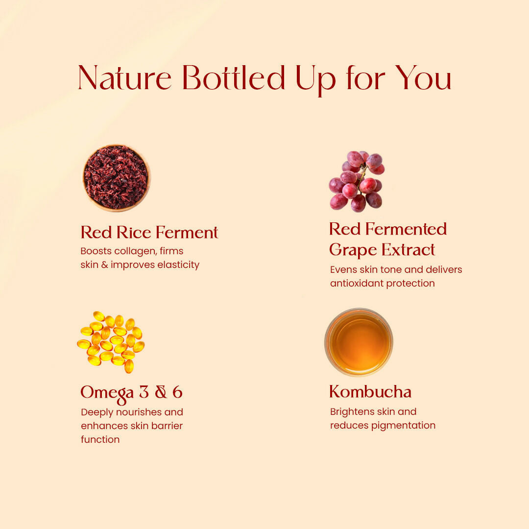 Red Rice Ferment, Red Wine Extract, Omega 3 & 6 Fatty Acids, Probiotics, Kombucha Ferment Extract, Natural Moisturizing Factors, Glycerin, Botanical Emollients, Aqua (Purified Water), Plant-Based Preservatives