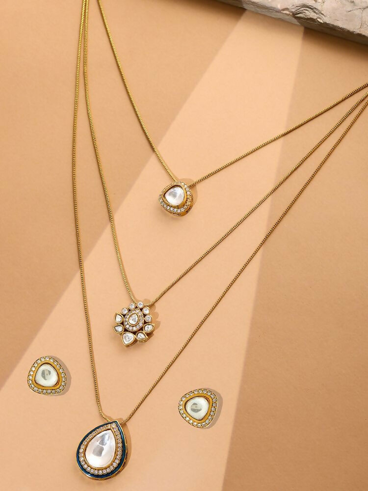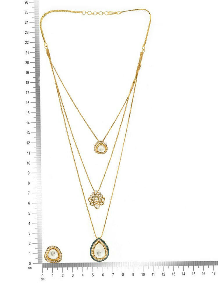 Expertly handcrafted, this elegant ensemble features luminous Kundan accents set against soothing mehendi tones for a rich, ethnic appeal. The necklace is designed with a graceful dew drop-shaped pendant that adds fluid elegance and draws the eye. Complementary earrings echo the same delicate form, creating a beautifully balanced look. Lightweight and versatile, this set is ideal for festive wear, traditional gatherings, or wedding celebrations. Style tip: Pair it with a pastel or jewel-toned outfit to let the pendant’s gentle shimmer truly shine.