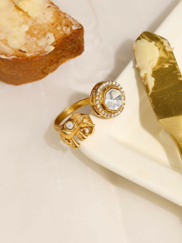 Celebrate tradition with Ruby Raang’s Kundan Gold Plated Elephant and Round Ring Set. This distinctive pair features a charming elephant motif ring alongside a classic round-shaped ring, both adorned with intricate Kundan detailing and finished in radiant gold plating. The fusion of symbolic artistry and elegant design makes this set a unique statement for festive occasions or cultural celebrations. Expertly crafted for comfort and style, these rings add a touch of heritage and sophistication to any outfit. Style tip: Pair with ethnic wear or simple outfits to let these standout rings shine.