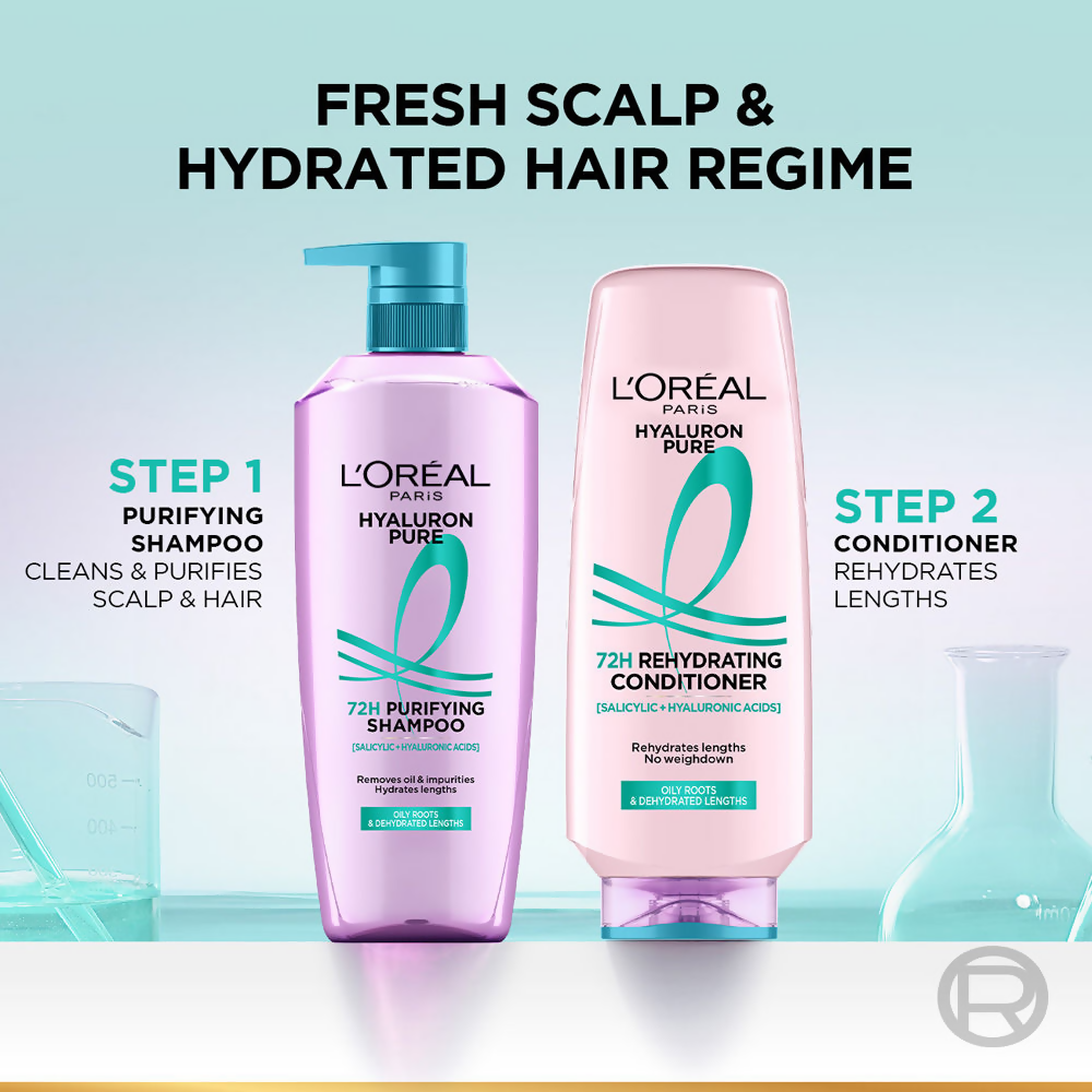 - Step 1: Apply L'Oreal Paris Hyaluron Pure 72H Purifying Shampoo on wet hair.Massage your scalp, cleansing from roots to tips.This step removes 99% of excess oil, leaving your scalp feeling refreshed and clean.