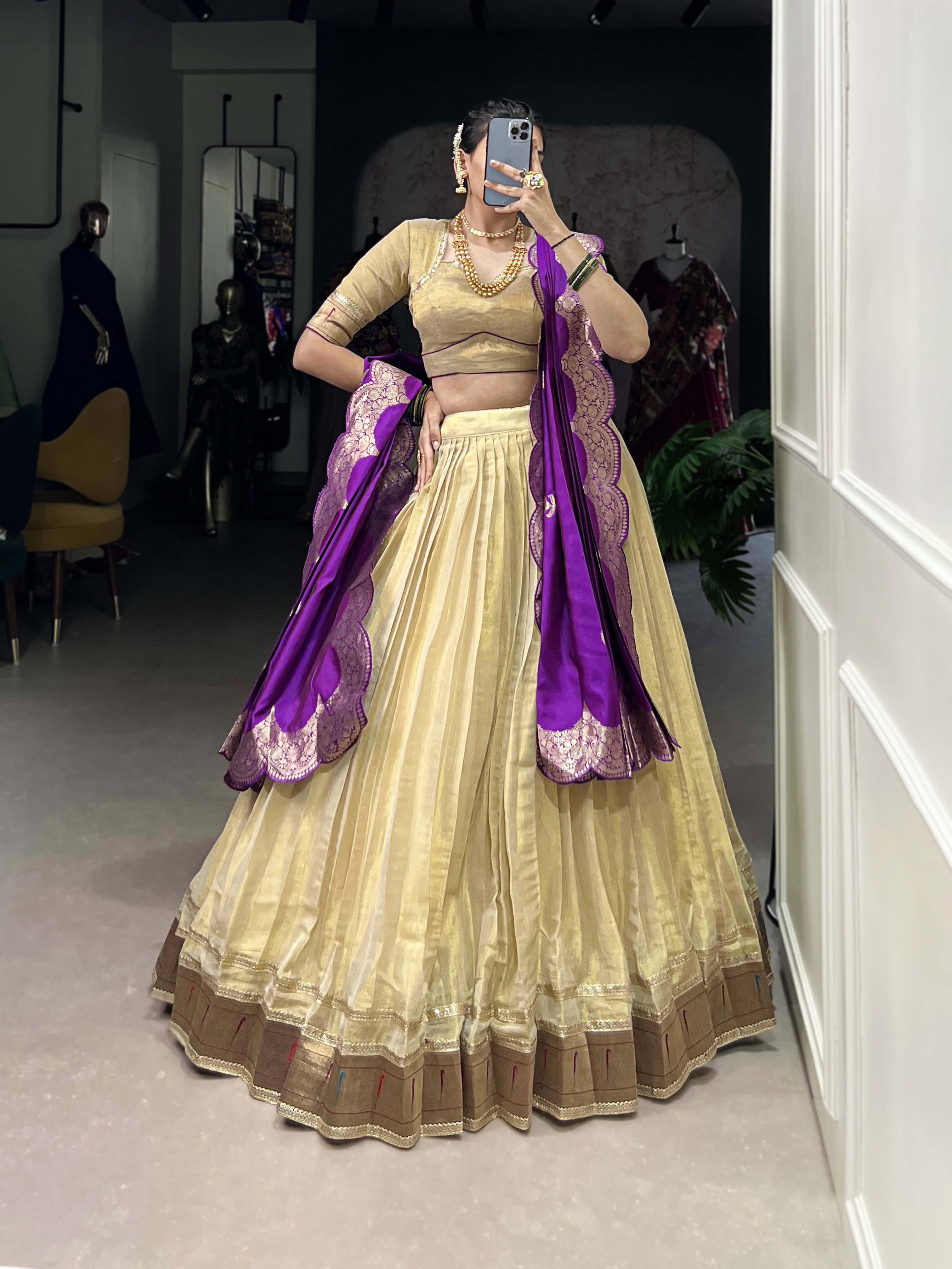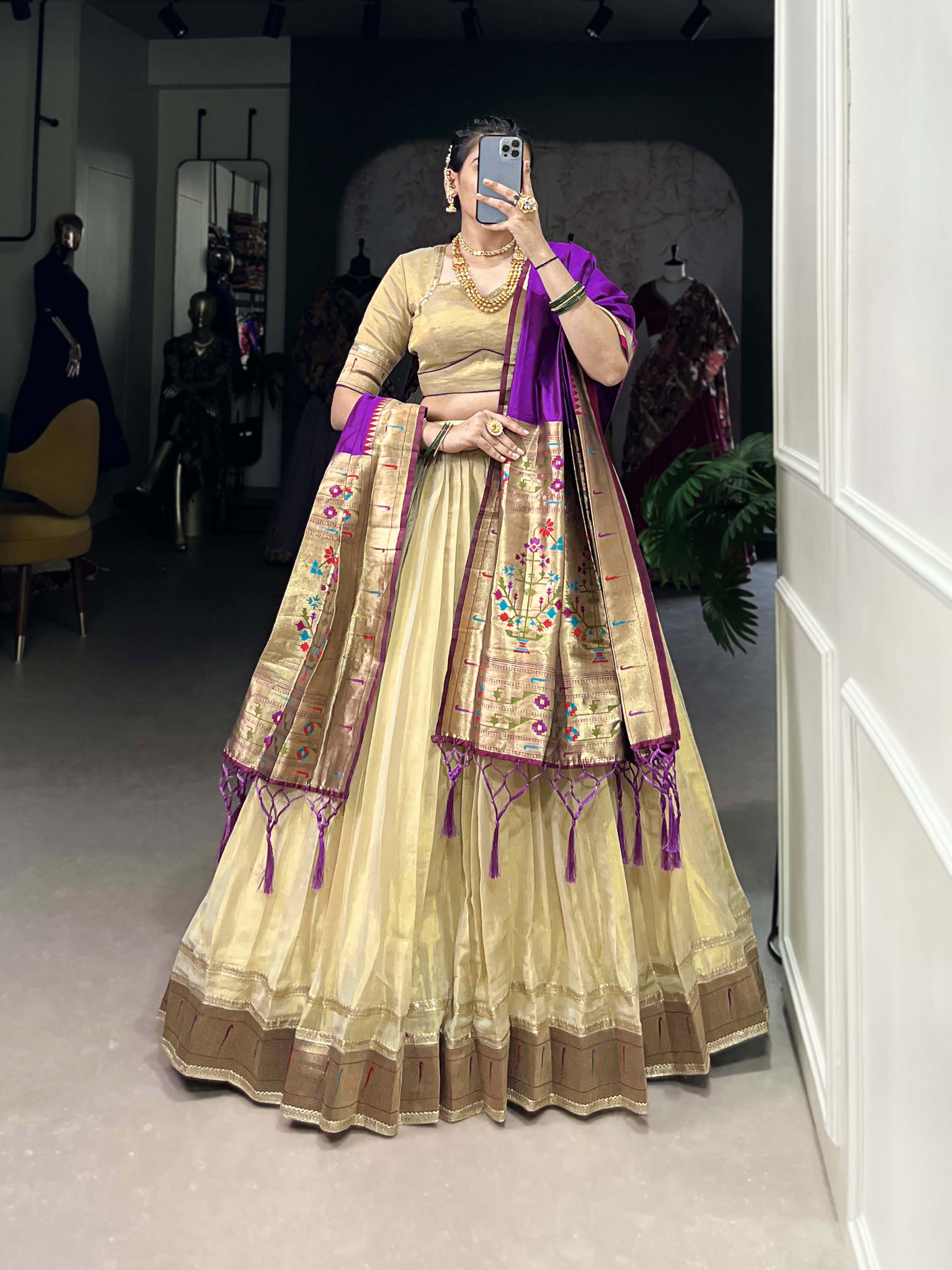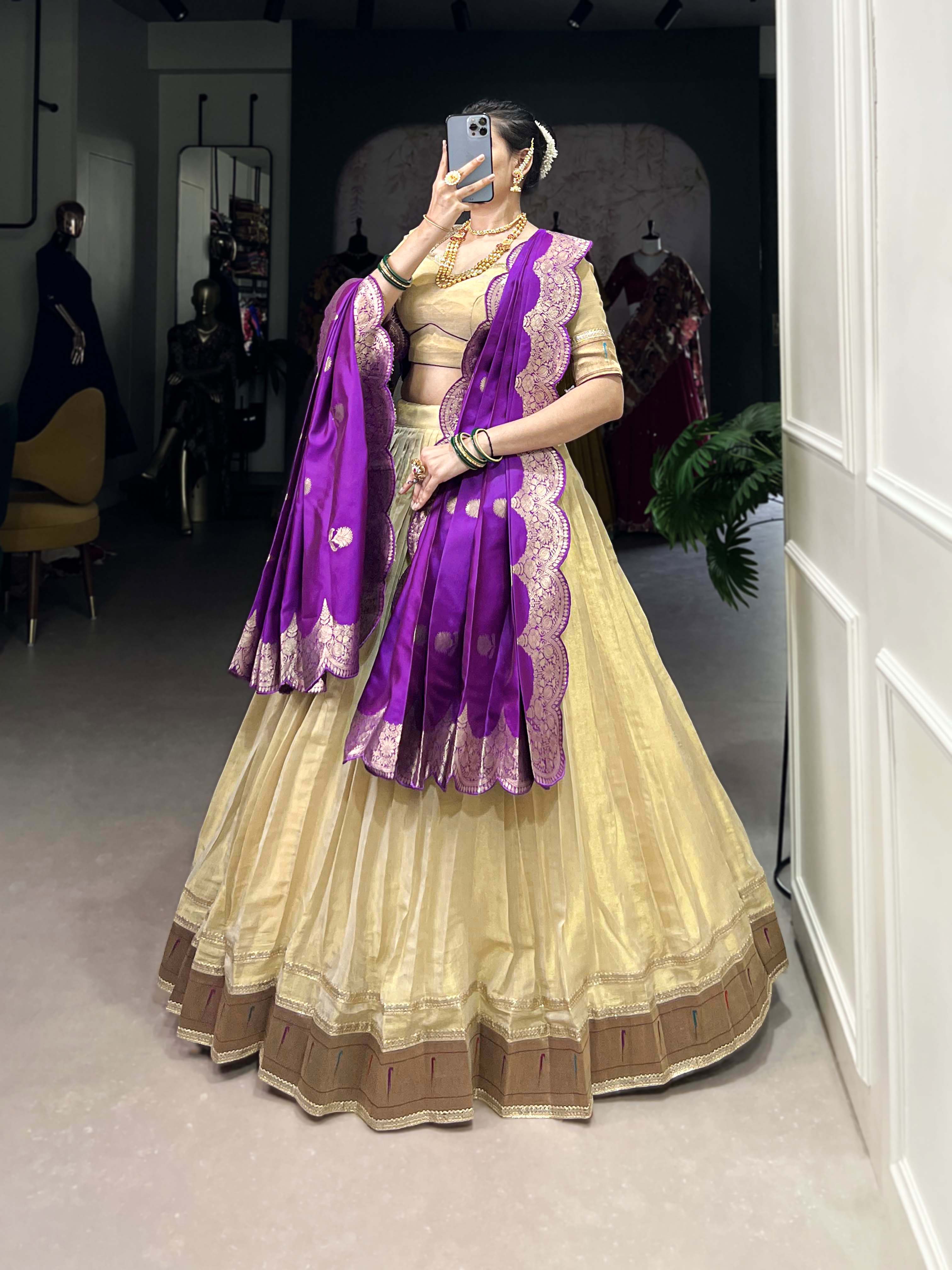 Lorenvalley Cream Erode Plain With Paithani Lace Border Lehenga Choli with Dupatta