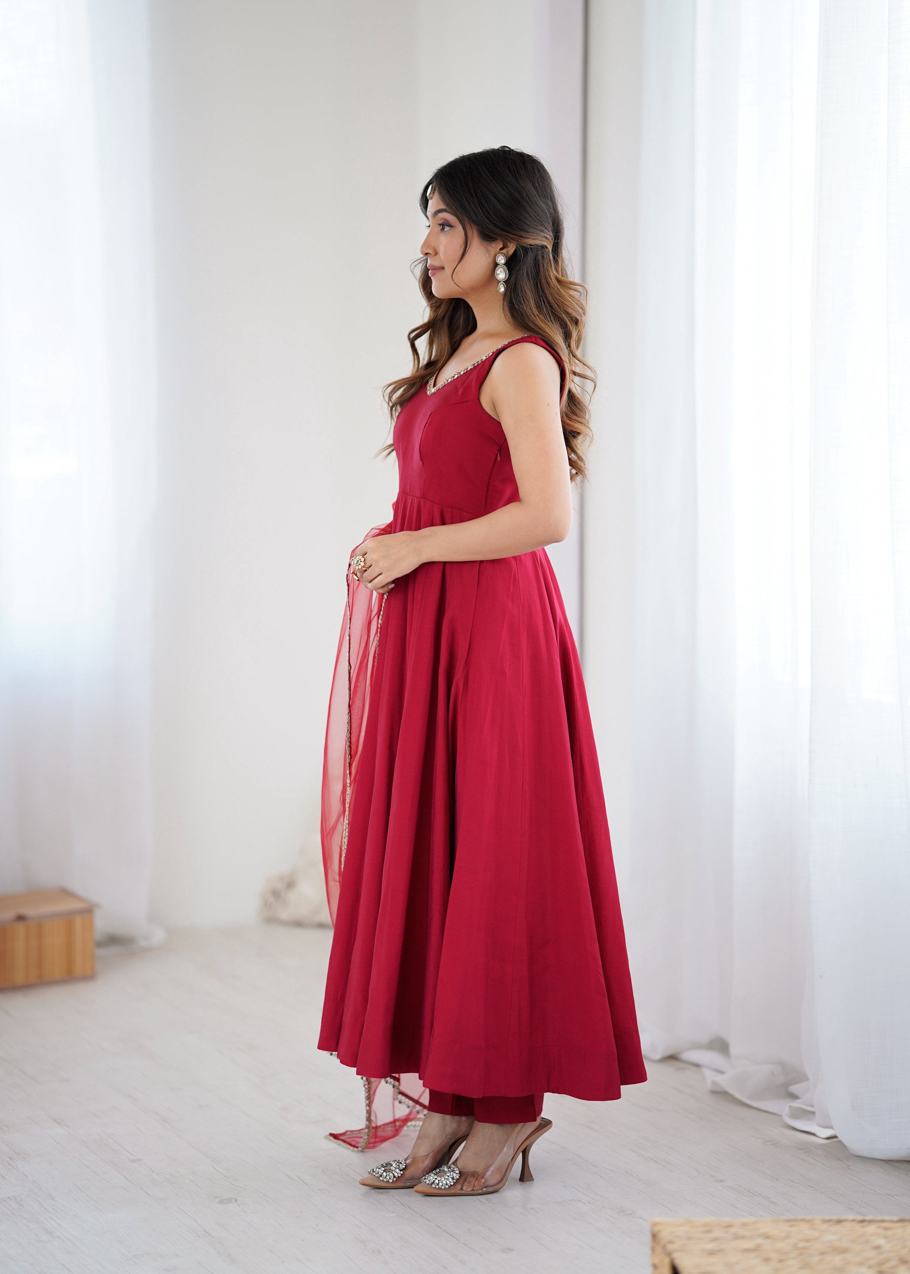 Lorenvalley Fashion Maroon Pure Romansilk Chanderi Fabric Yoke Fancy Lace Work Anarkali Kurta Pant With Dupatta Set