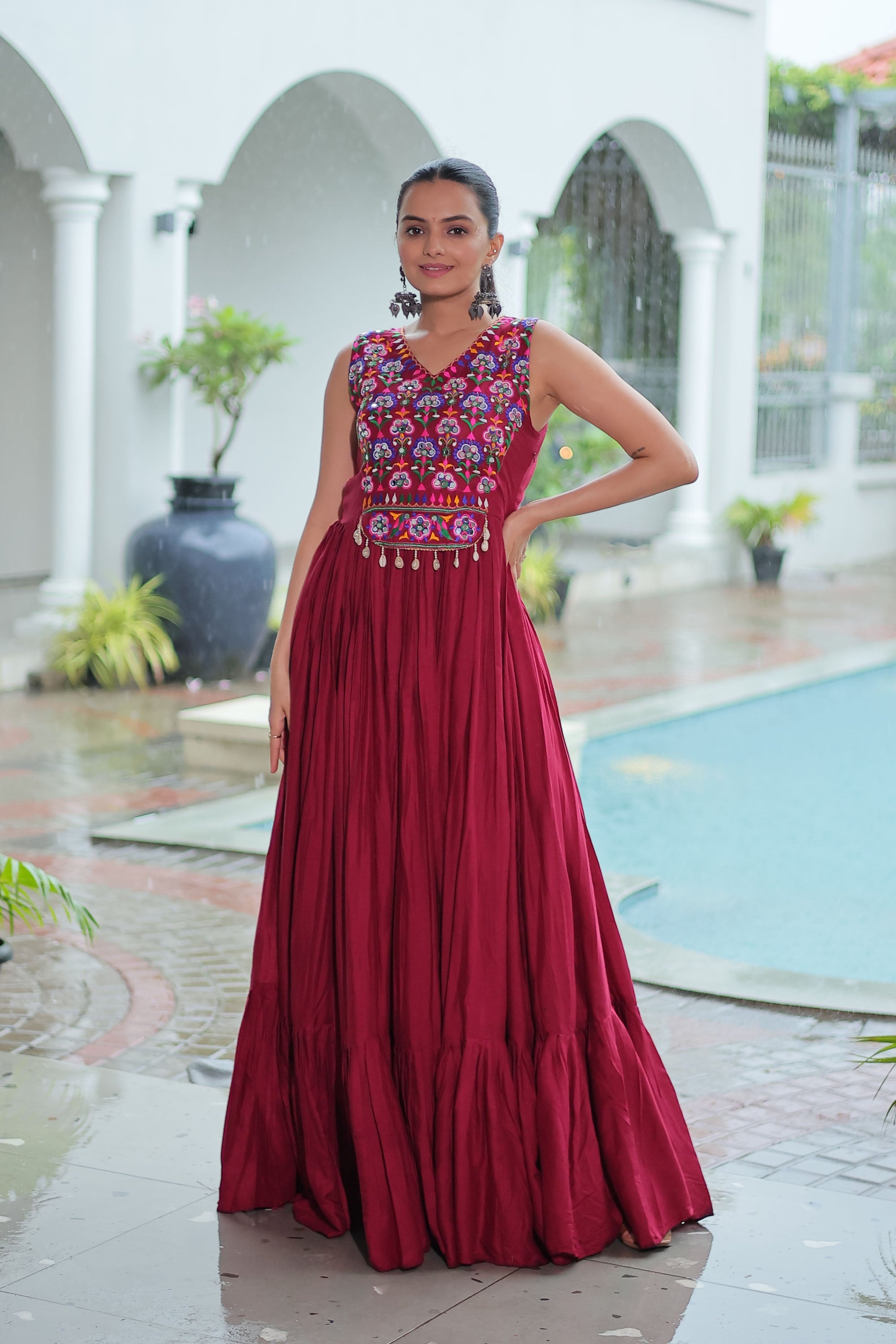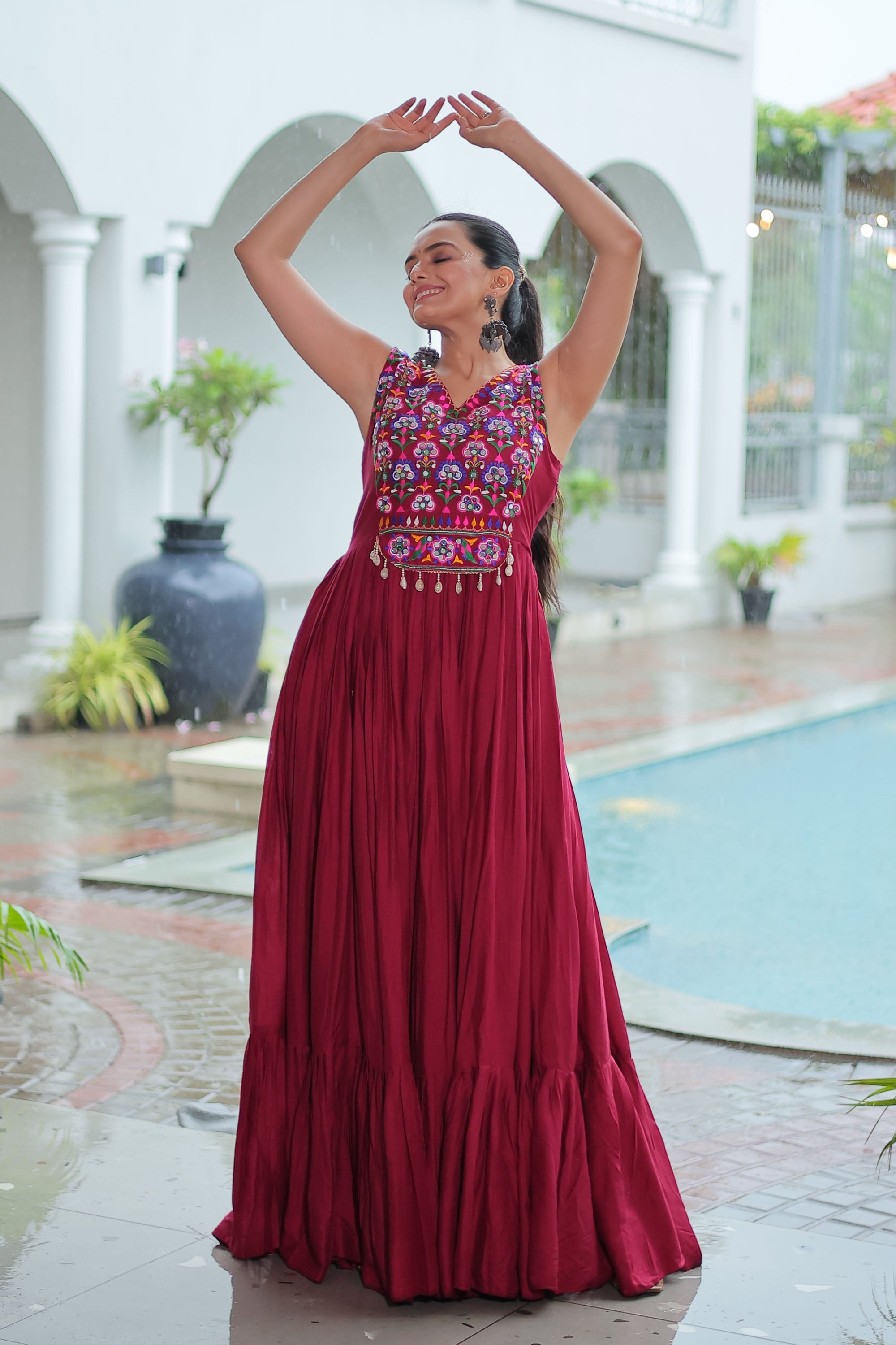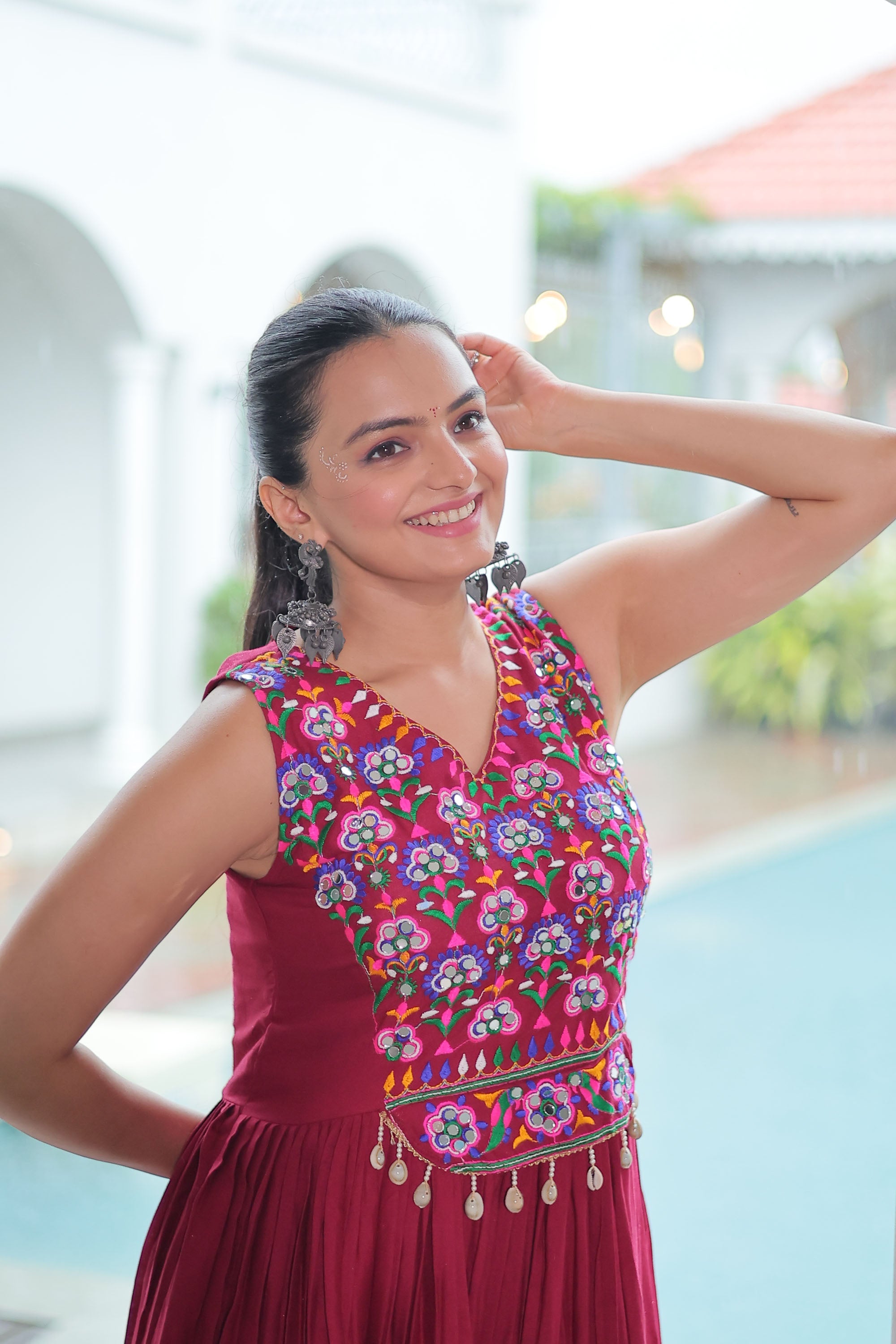 Lorenvalley Fashion Maroon Rayon Kutchi Gamthi Thread Embroidered & mirror Work Gown