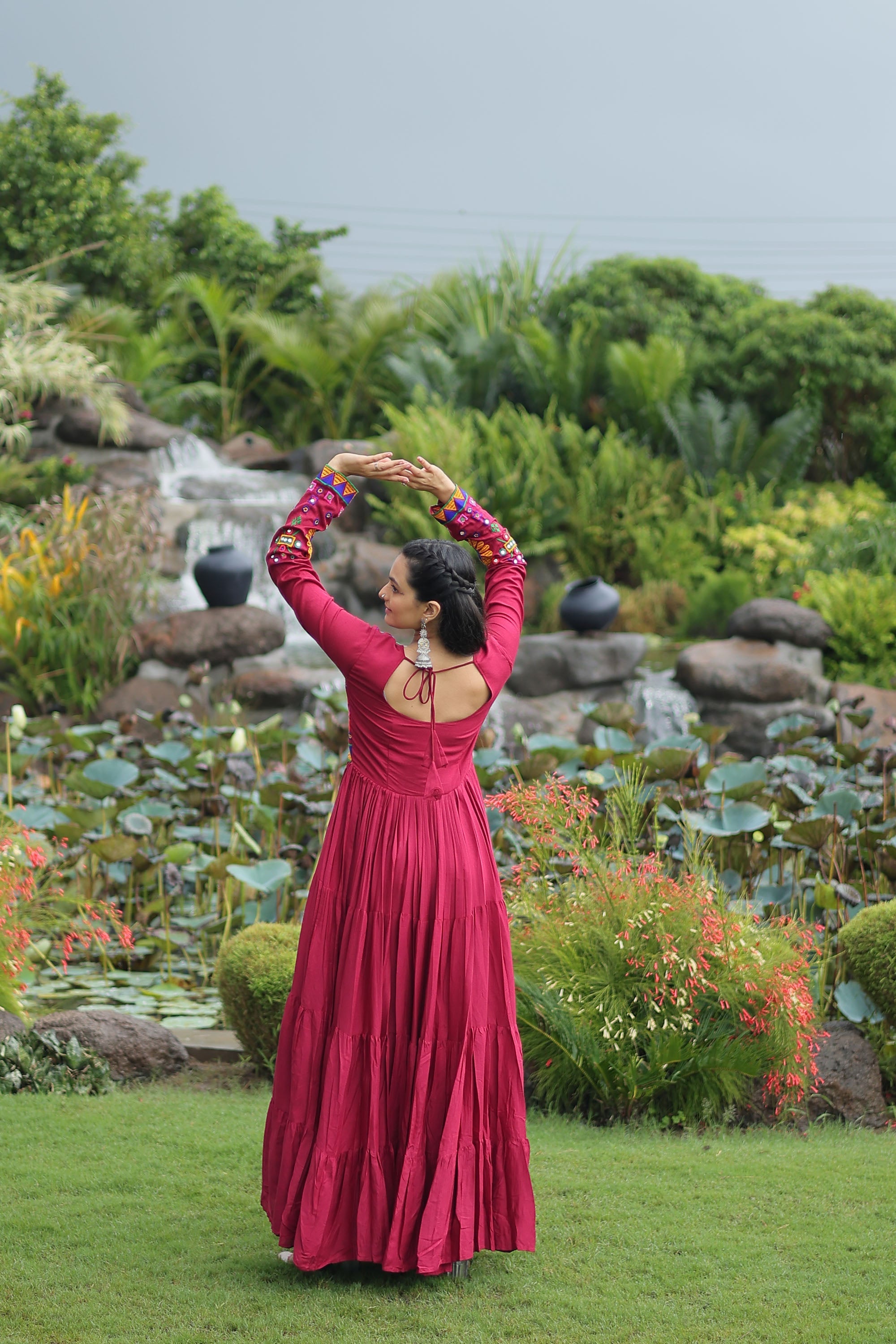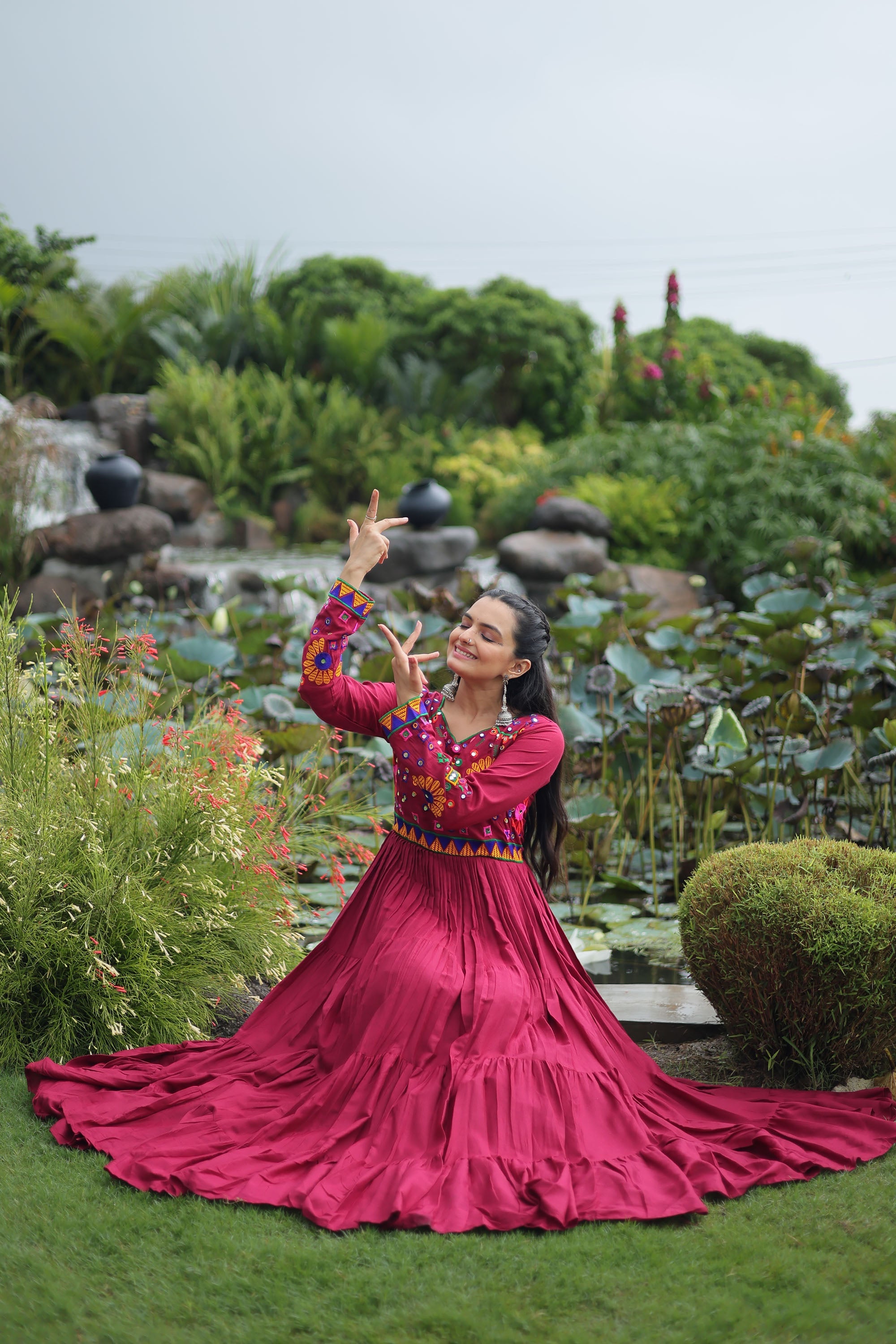 Lorenvalley Fashion Maroon Rayon Kutchi Gamthi Work Gown