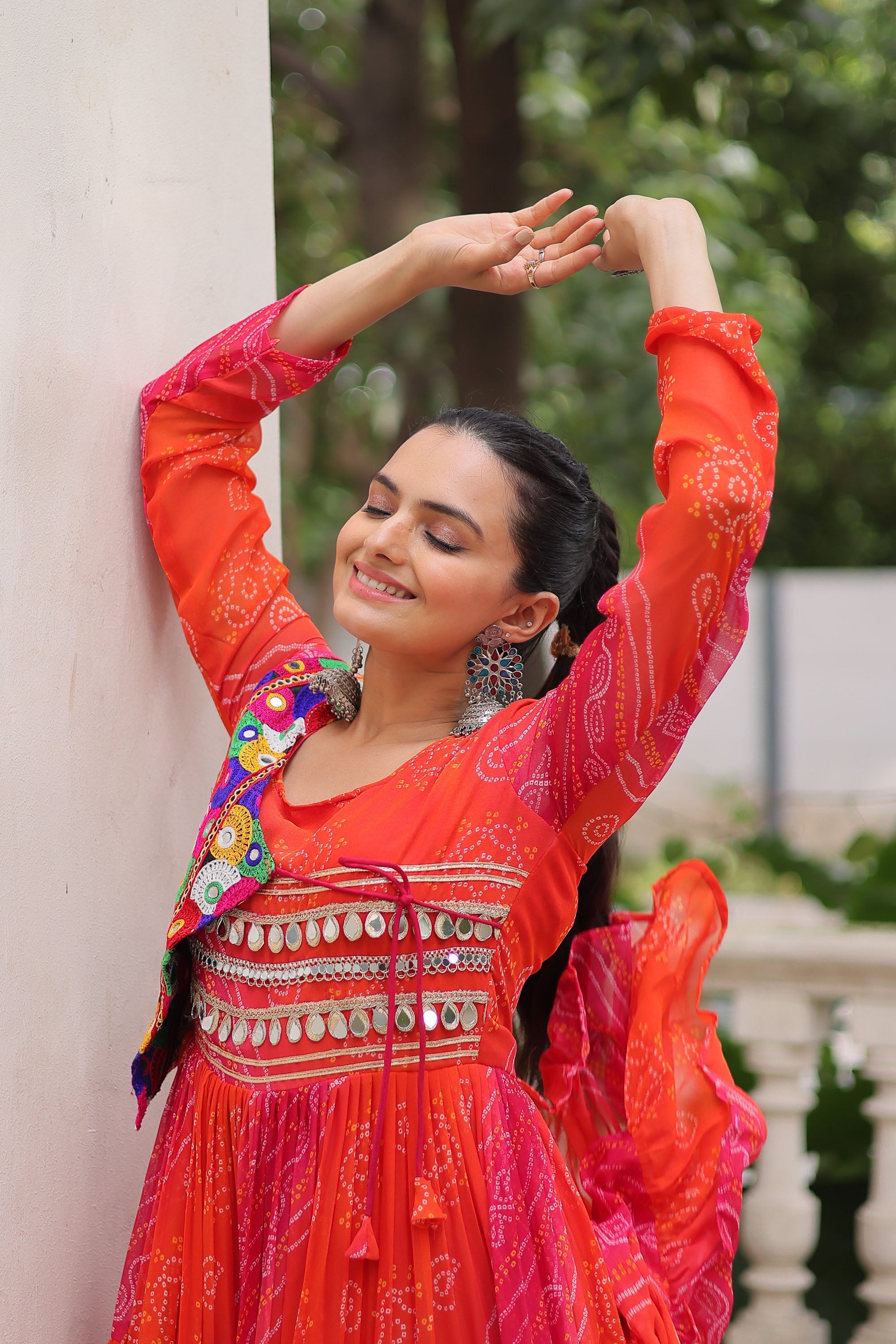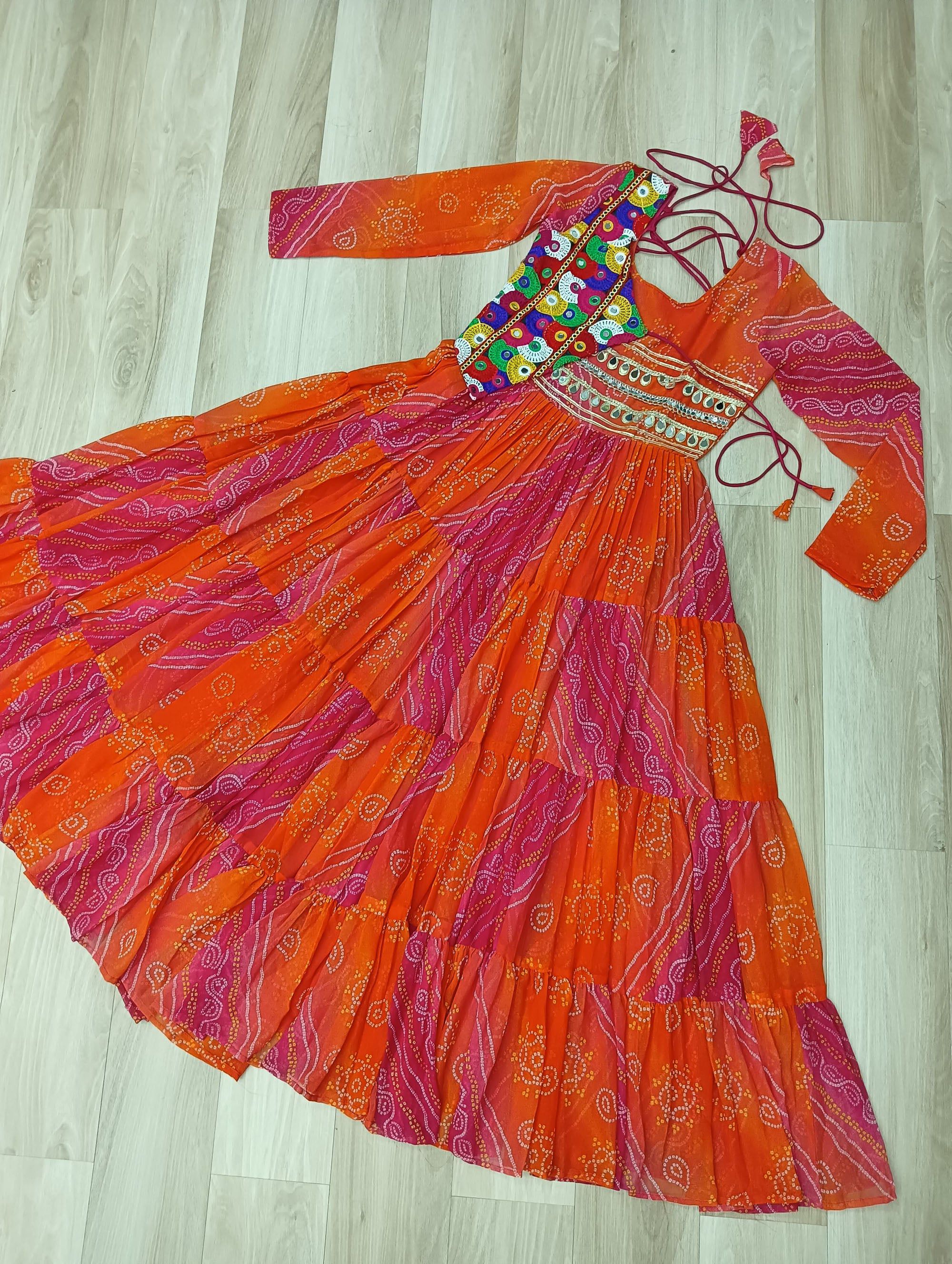 Lorenvalley Fashion Multicolor Faux Georgette Laheriya & Bandhej Print with kutchi patche work Gown