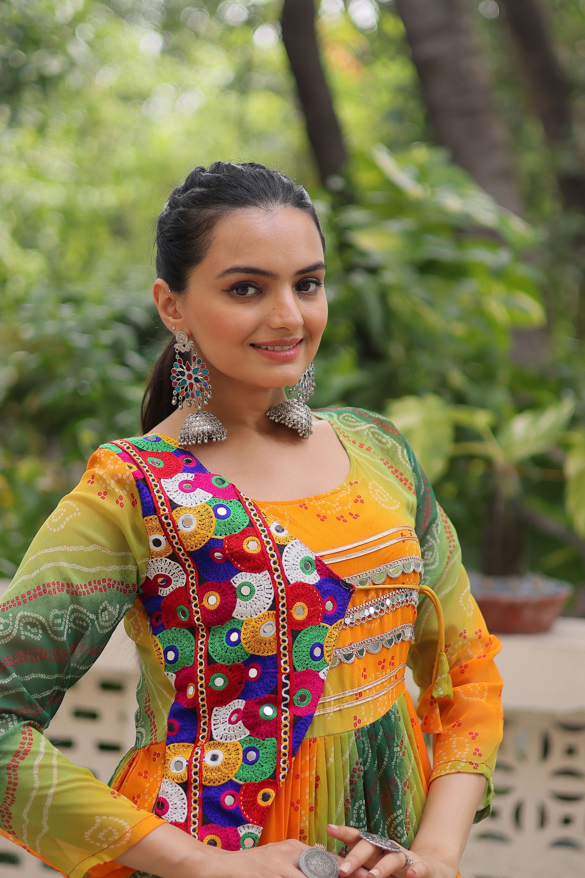 Lorenvalley Fashion Multicolor Faux Georgette Laheriya & Bandhej Print with kutchi patche work Gown