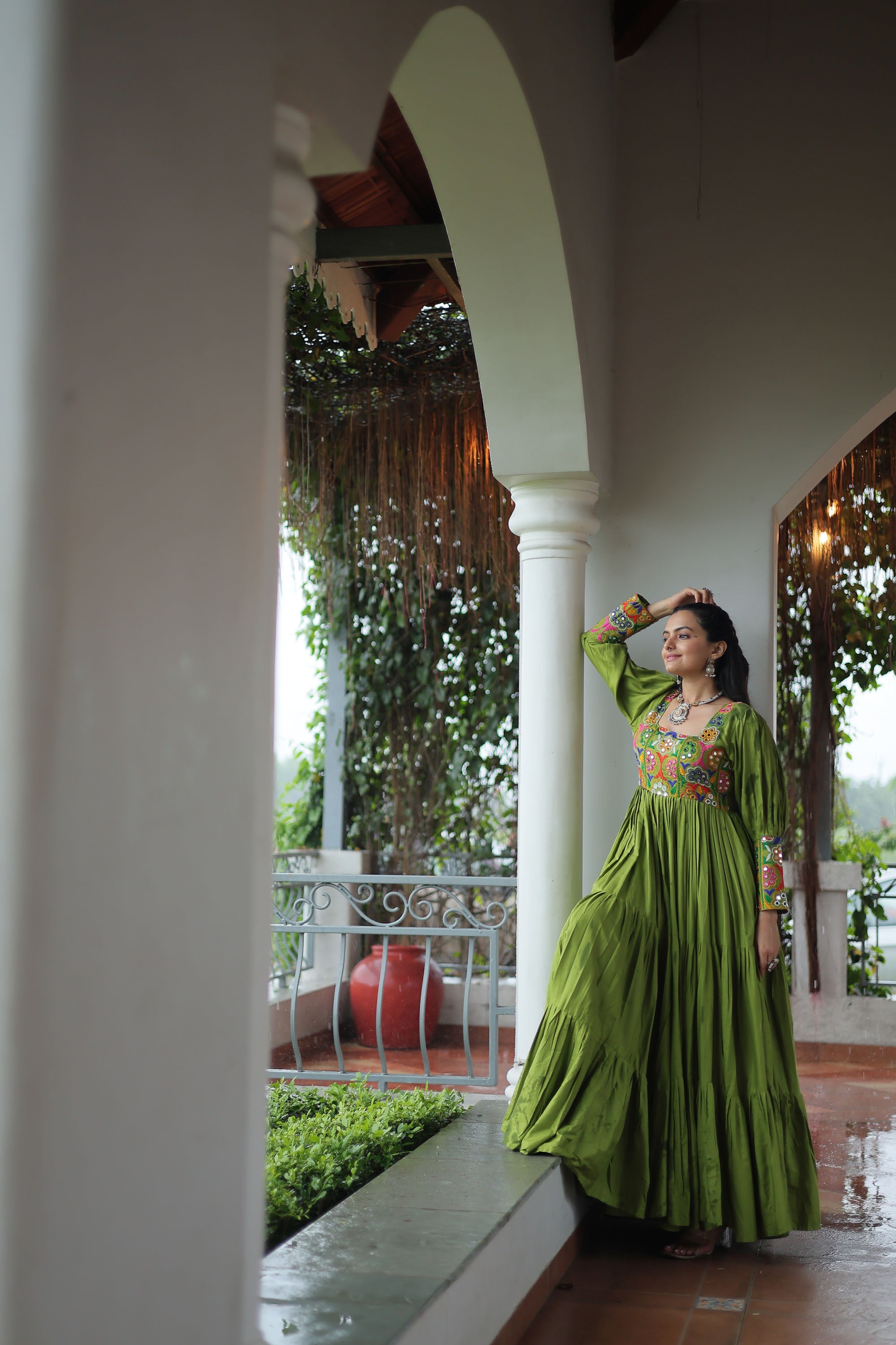 Lorenvalley Fashion Parotgreen Rayon with Kutchi Gamthi Work Gown