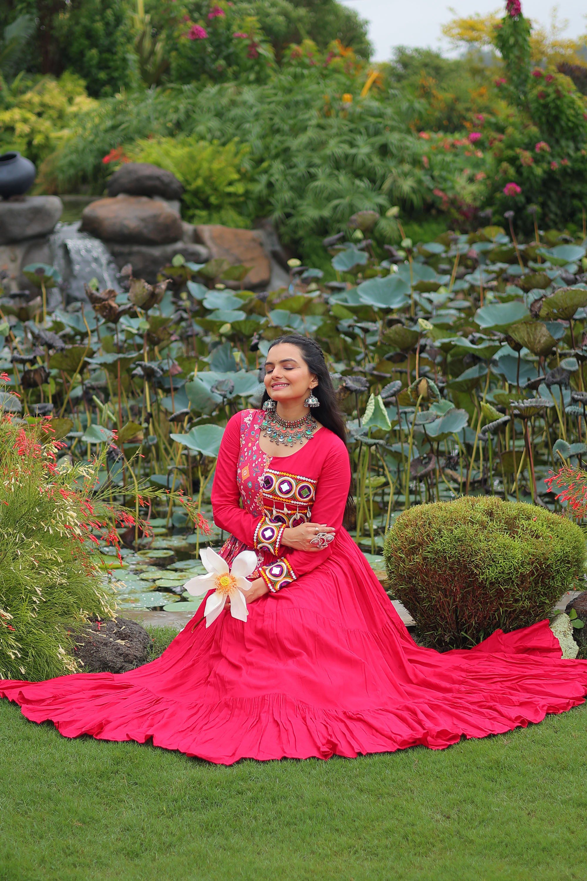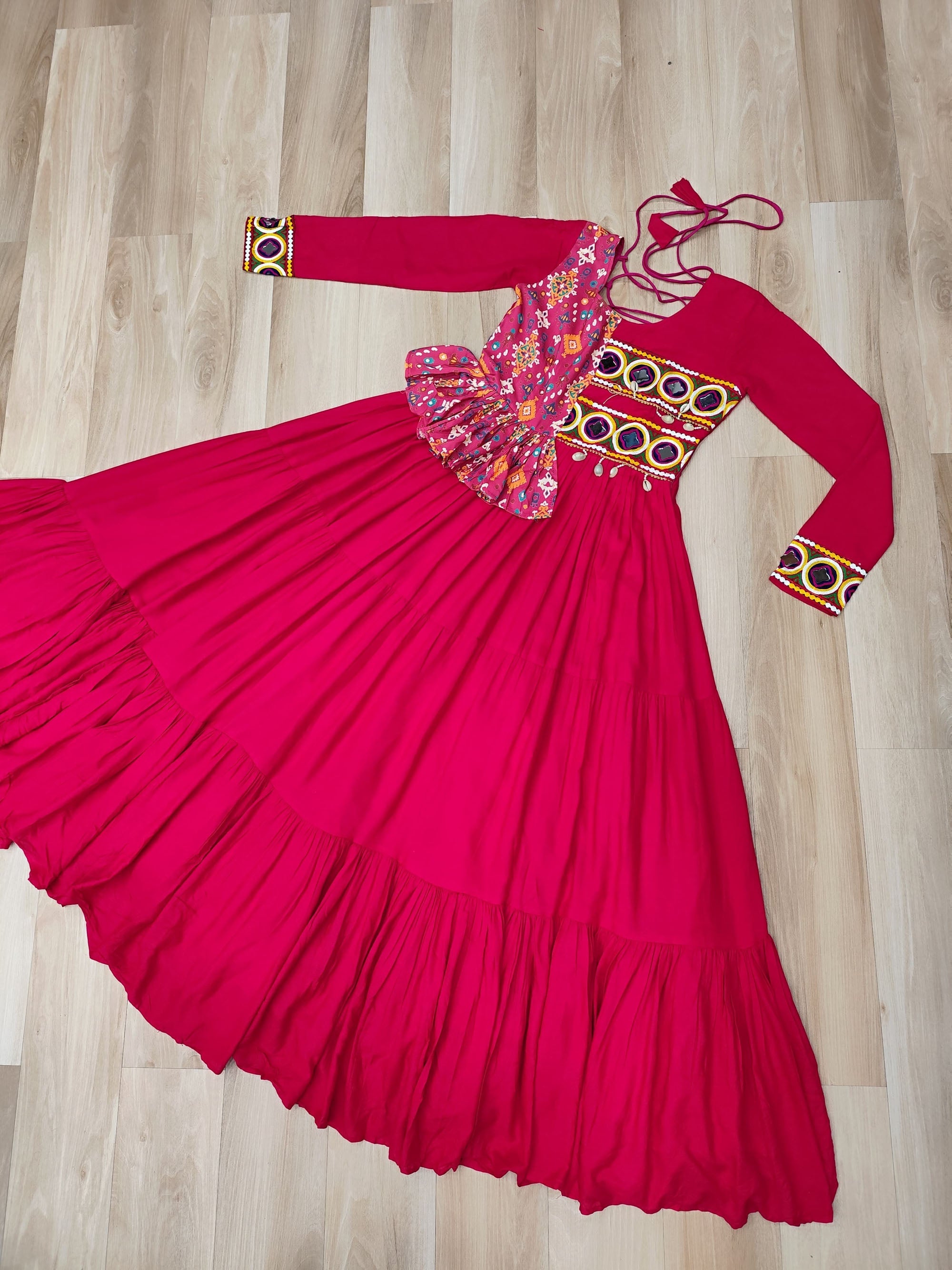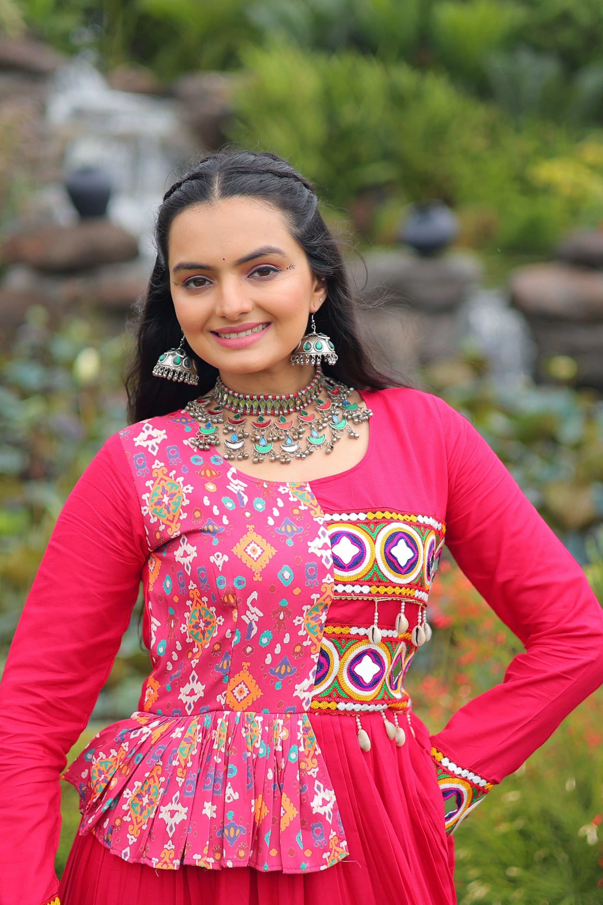 Lorenvalley Fashion Pink Rayon Kutchi Gamthi Embroidered Work & Cotton Print Work Gown