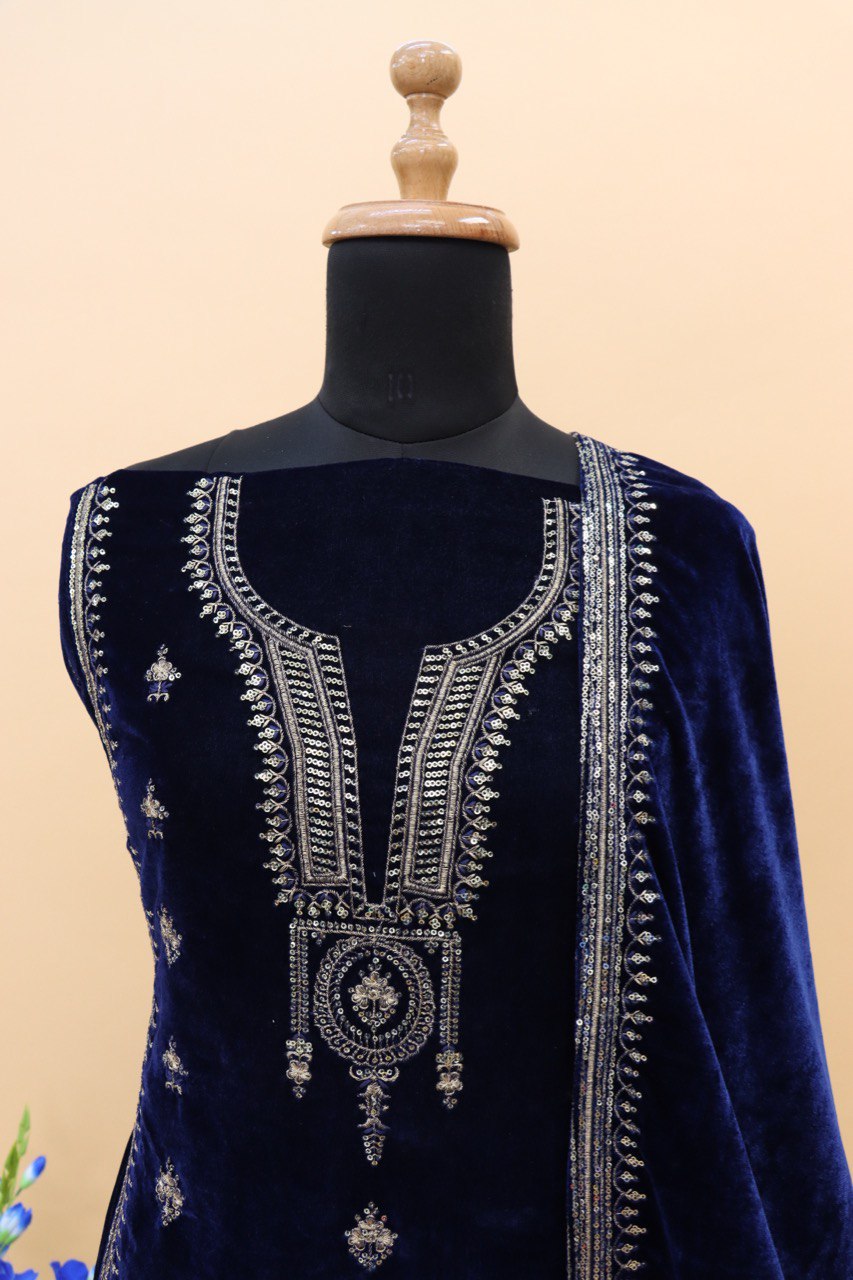 Lorenvalley Fashion Women Blue Velvet Embroidered Salwar Suit Material