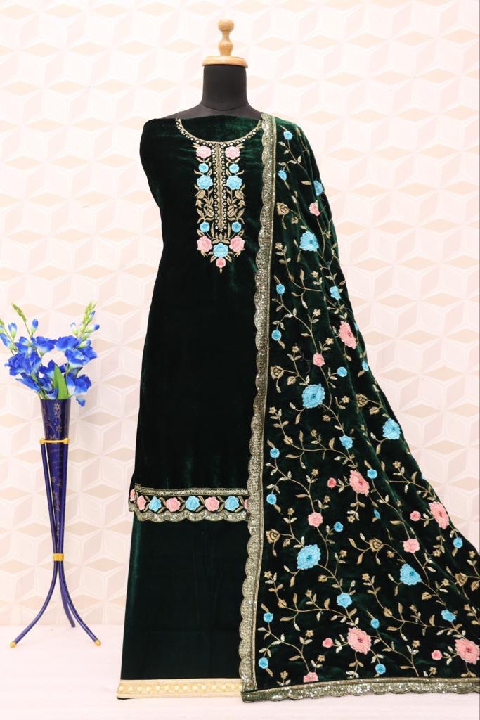 Lorenvalley Fashion Women Green Velvet Embroidered Salwar Suit Material
