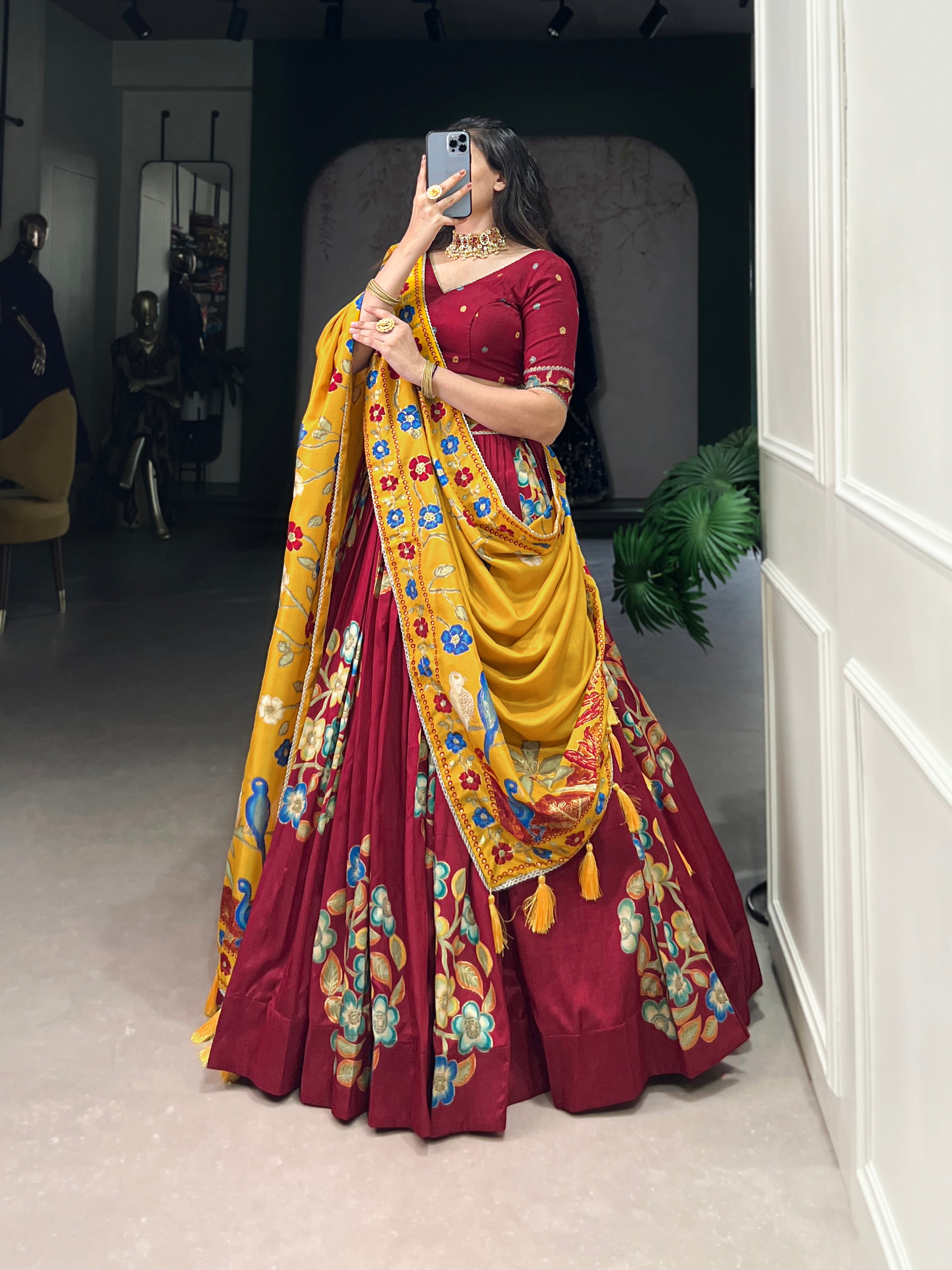 Lorenvalley Maroon Tussar Silk Printed And Foil Work With Lace Touch Up Lehenga Choli with Dupatta