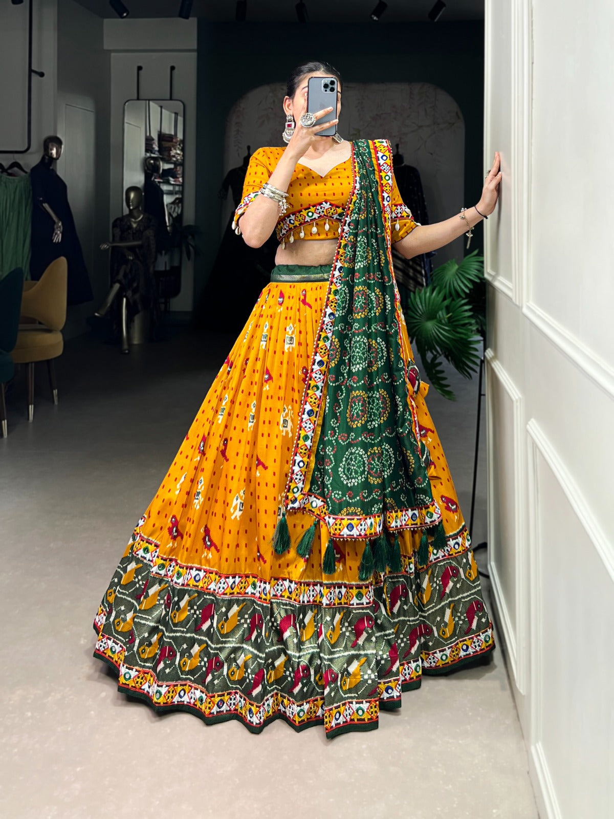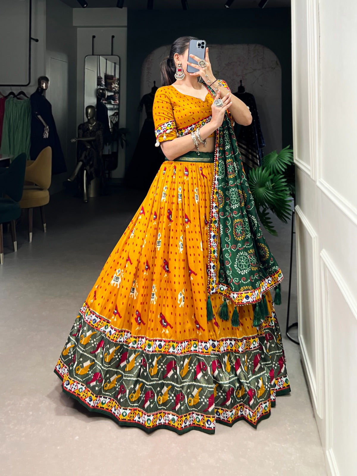 Lorenvalley Mustard Tussar Silk Patola Print with Gamthi Work Lace and Foil Work Lehenga Choli with Dupatta
