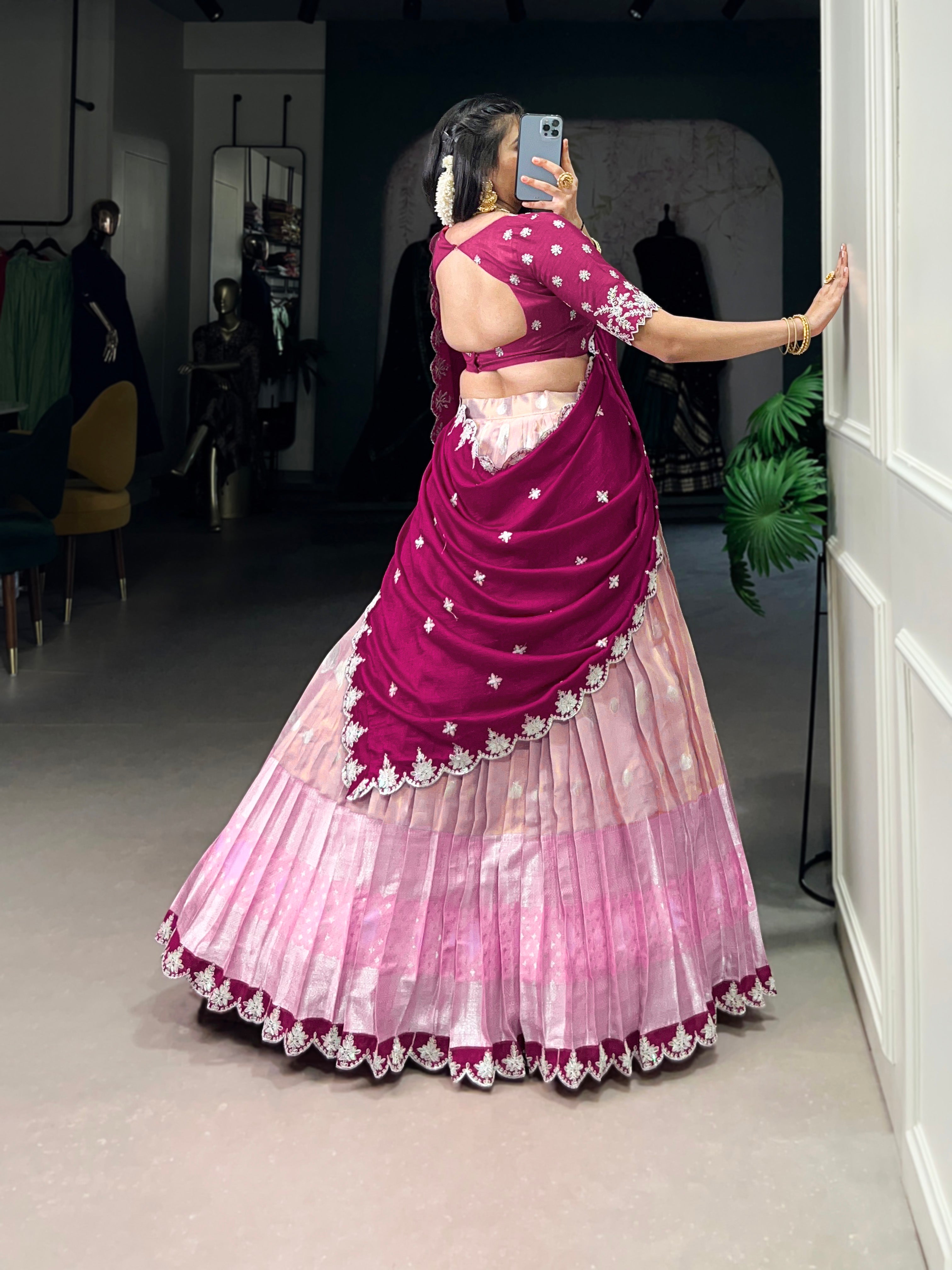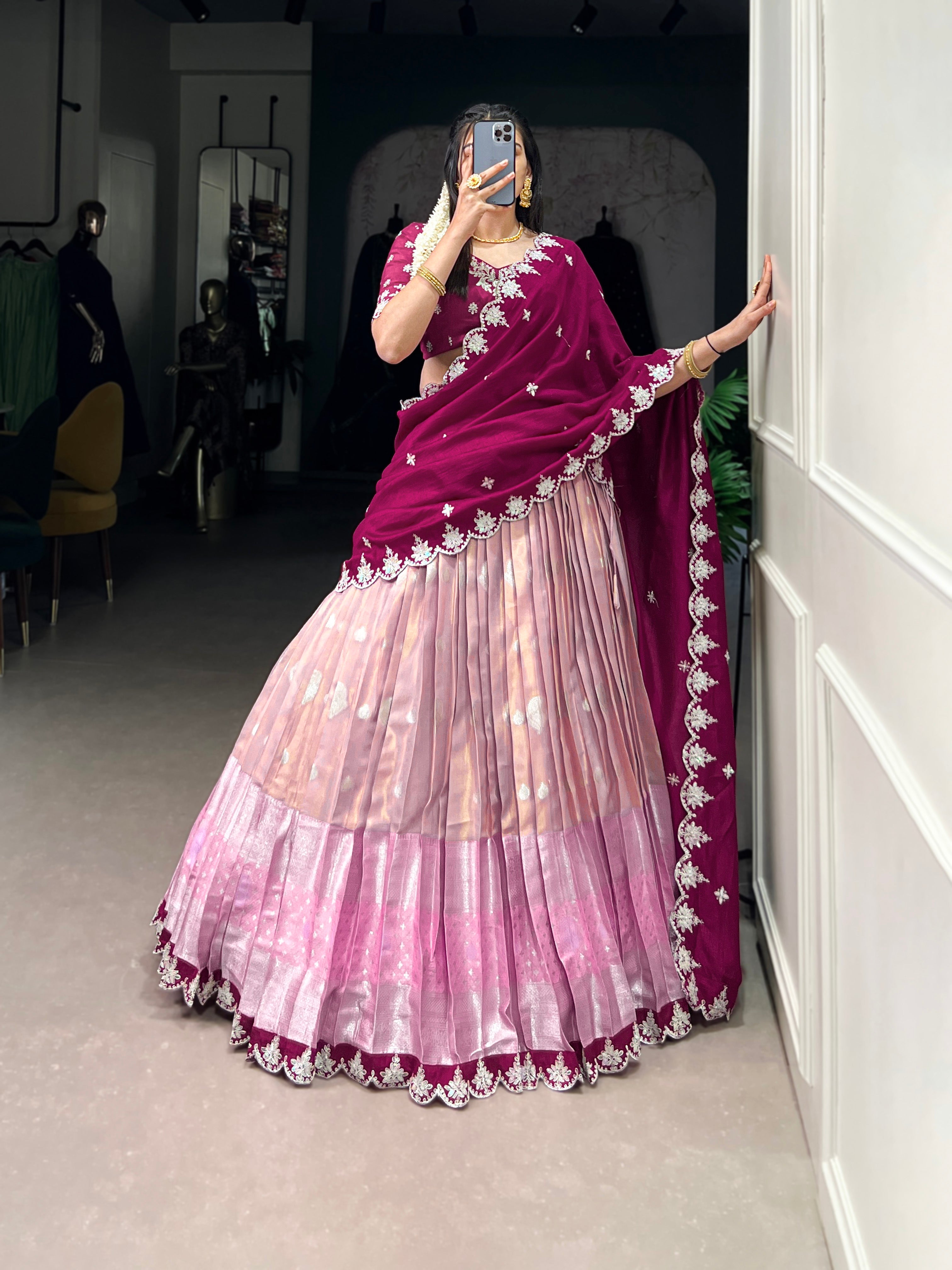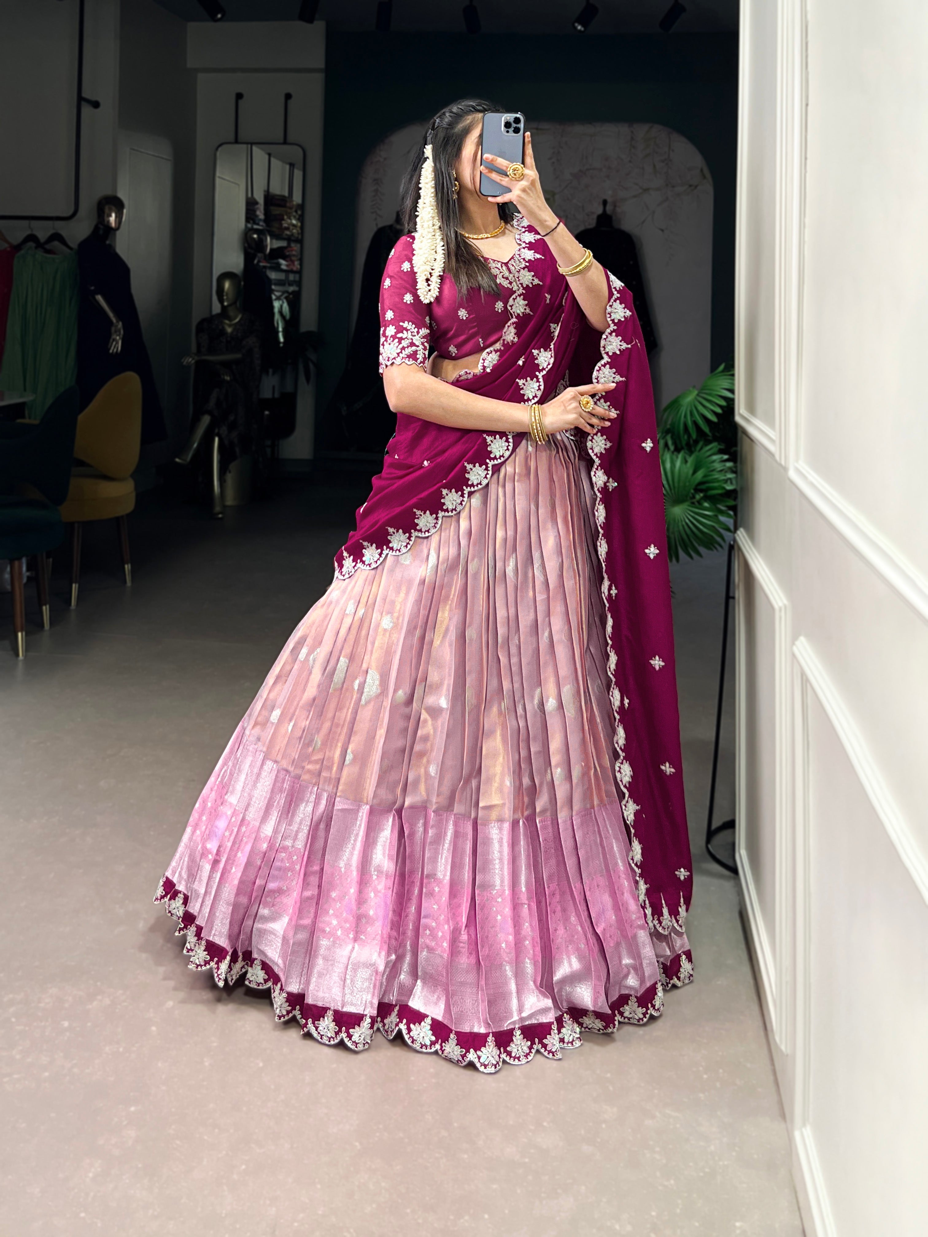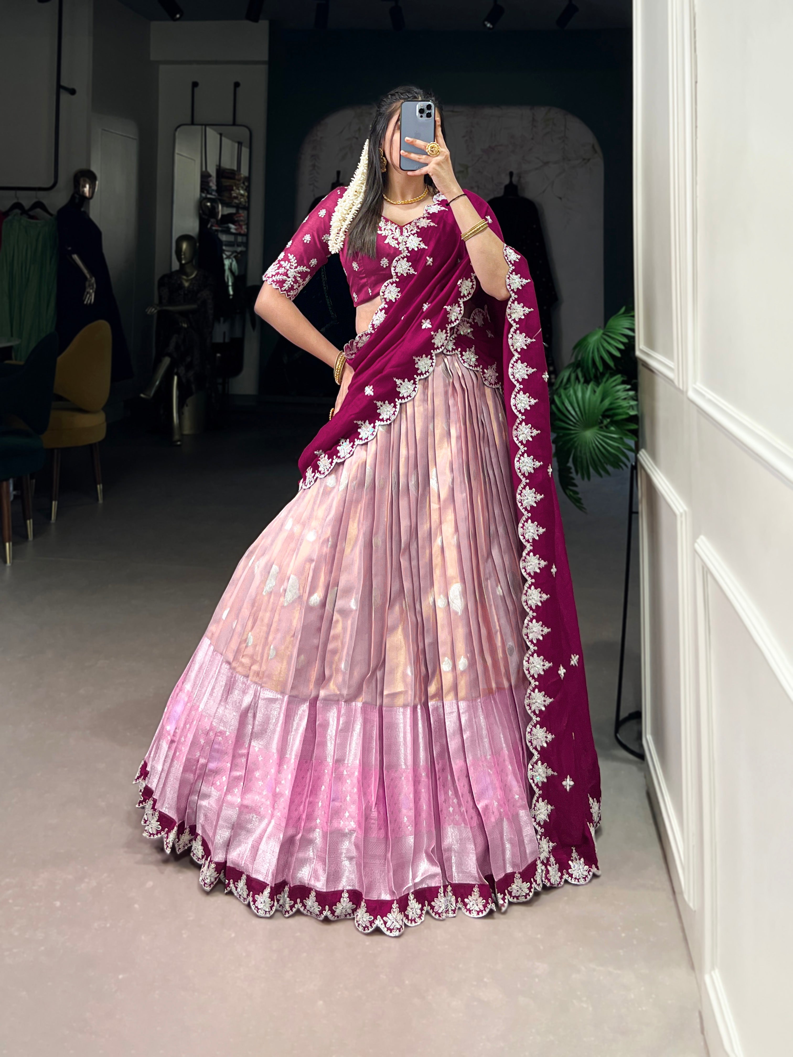 Lorenvalley Pink Zari Kota Zari Weaving Work With Sequins and Thread Embroidery Scallop Lace Border Lehenga Choli with Dupatta