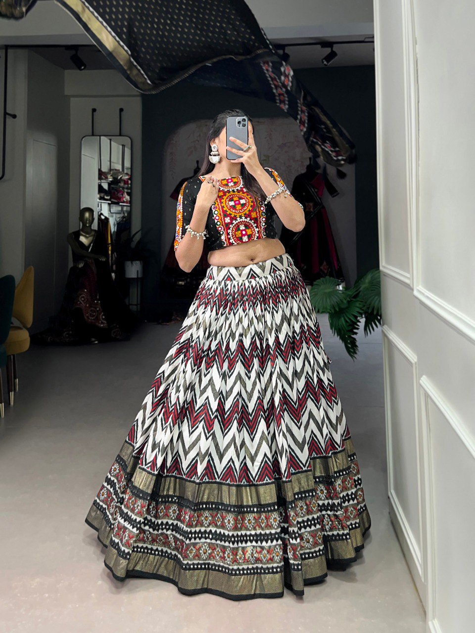 Lehenga Work : Leheriya With Foil Print And Paper Mirror Work Lace Touch Up
