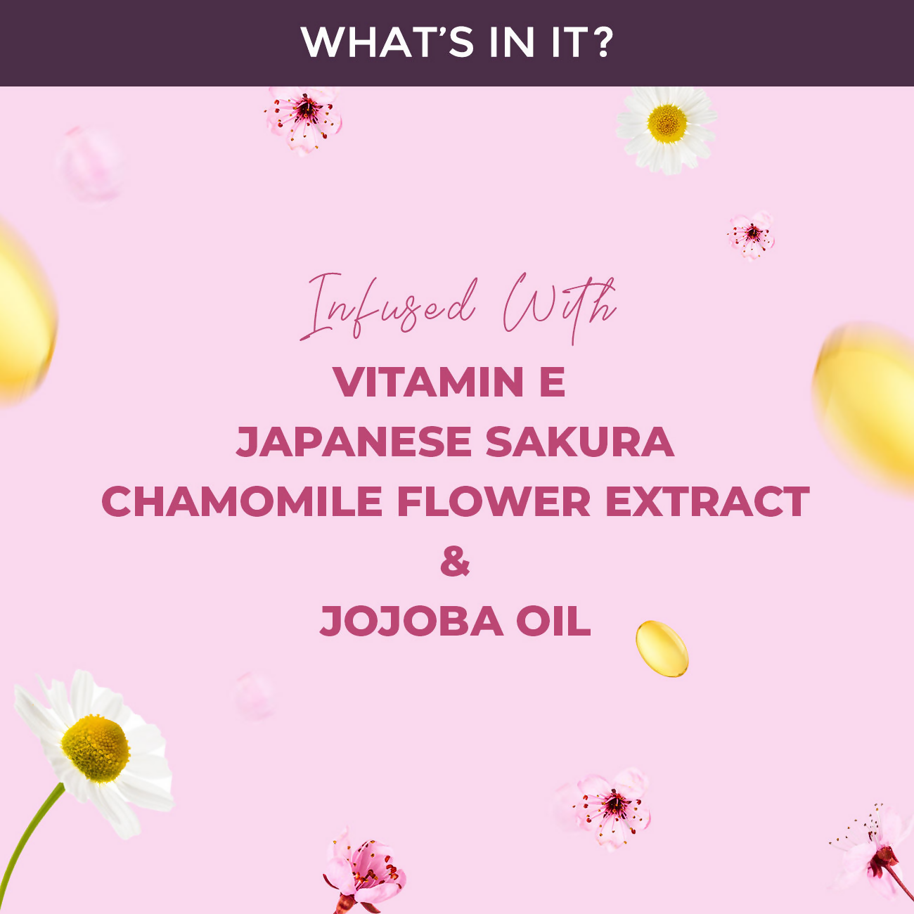 Japanese Sakura, Jojoba Oil, Chamomile Flower, Vitamin E