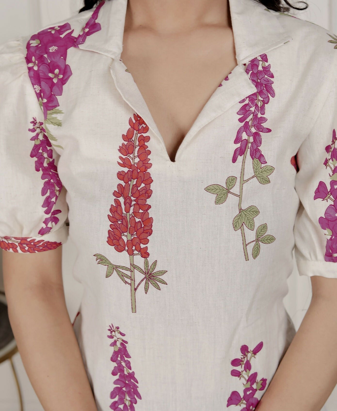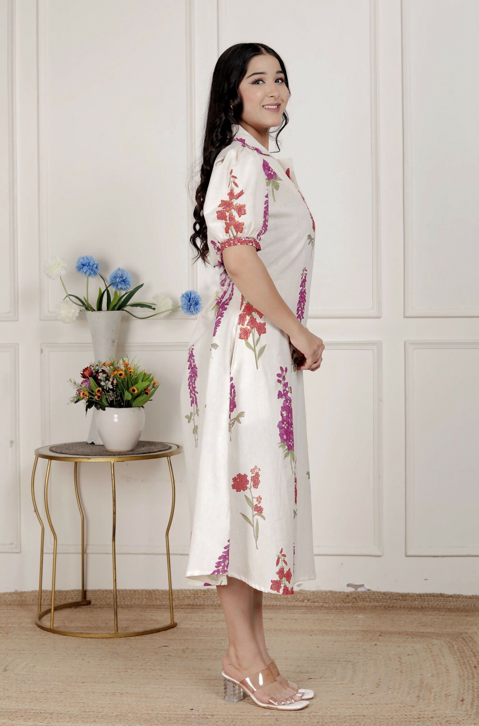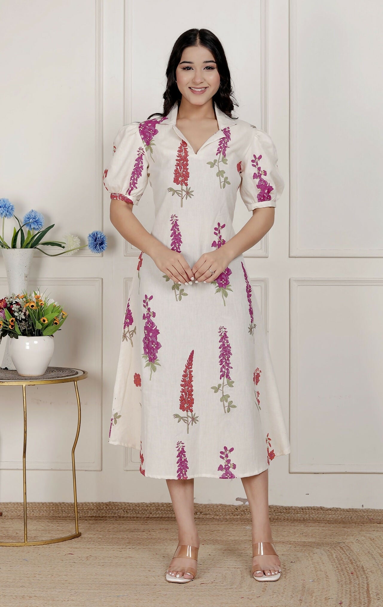 Miravan Womens Off White Flower Printed Cotton Flex Maxi Dress