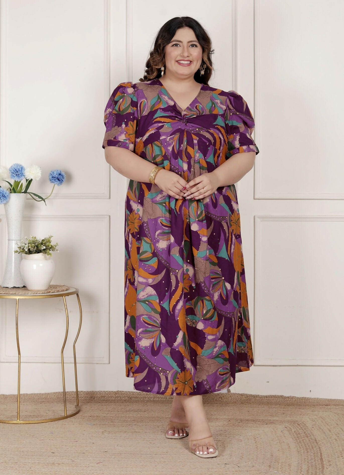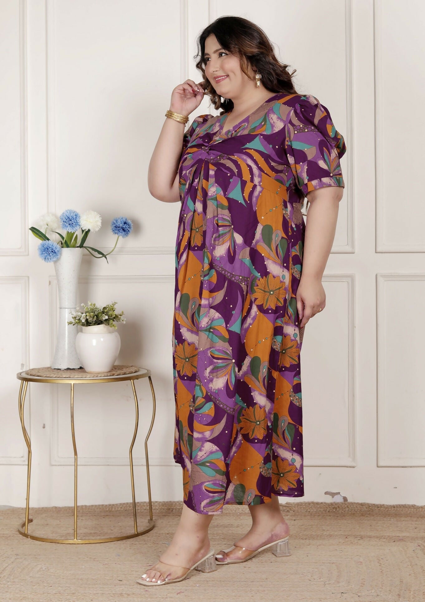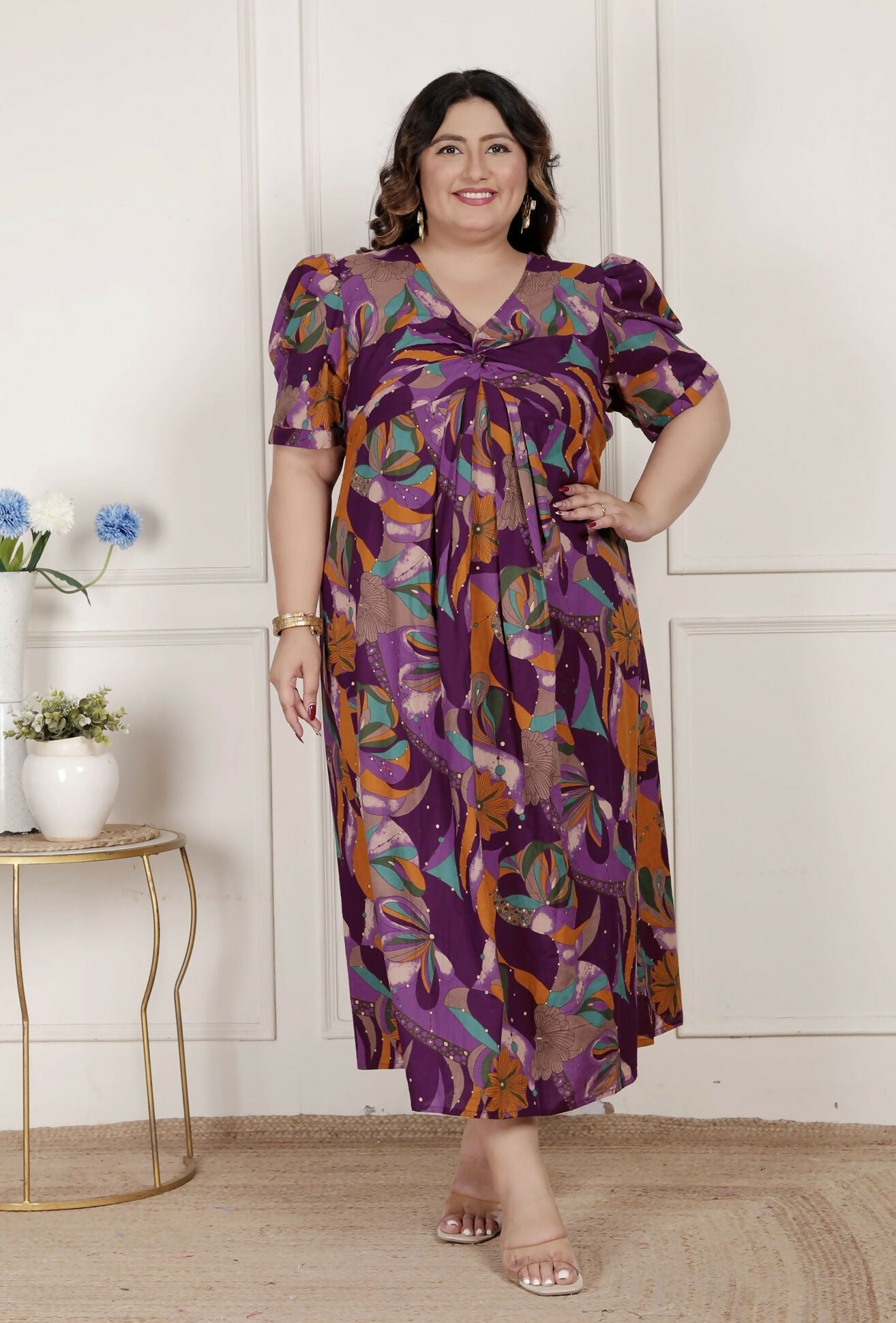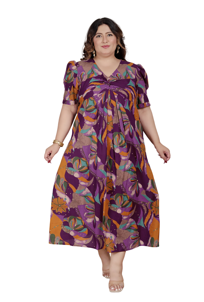 Miravan Womens Plus Size Floral Print Puff Sleeve Pure Cotton Magenta Butterfly Maxi Dress