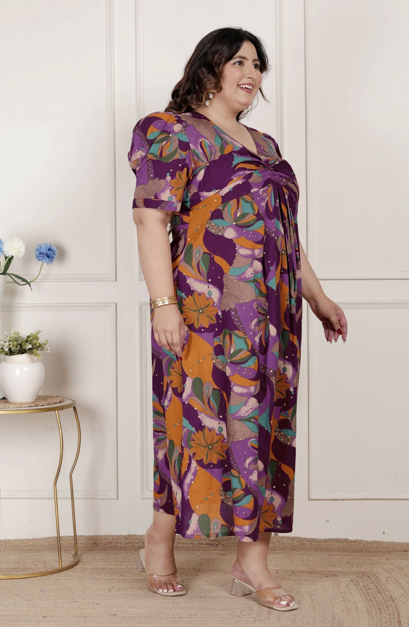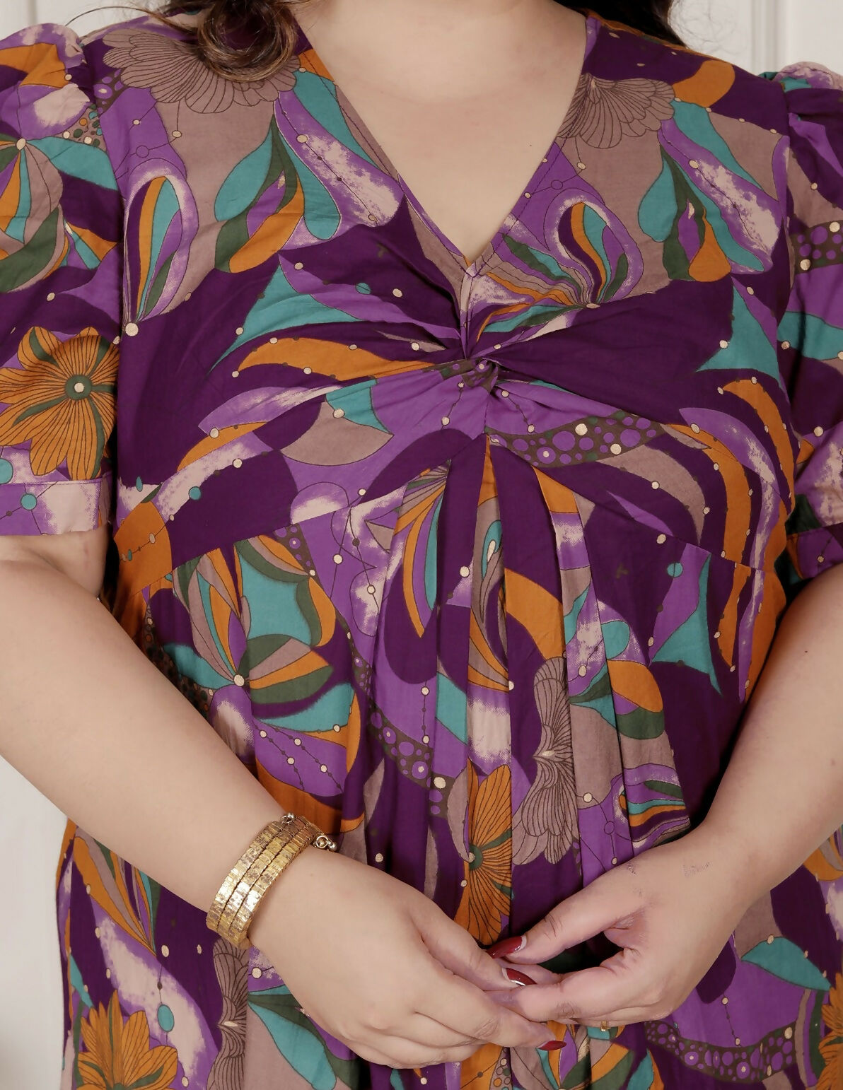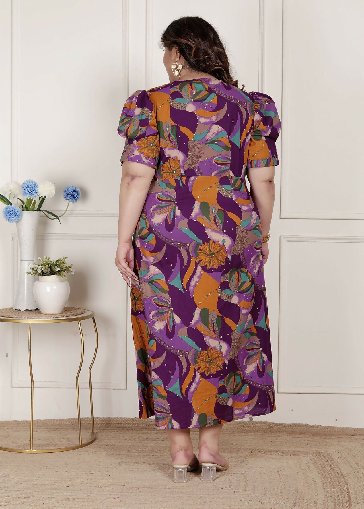 Miravan Womens Plus Size Floral Print Puff Sleeve Pure Cotton Magenta Butterfly Maxi Dress