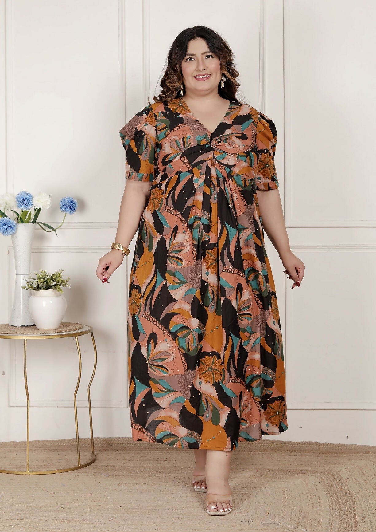 Miravan Womens Plus Size Pure Cotton Black Puff Sleeve Floral Printed Butterfly Maxi Dress