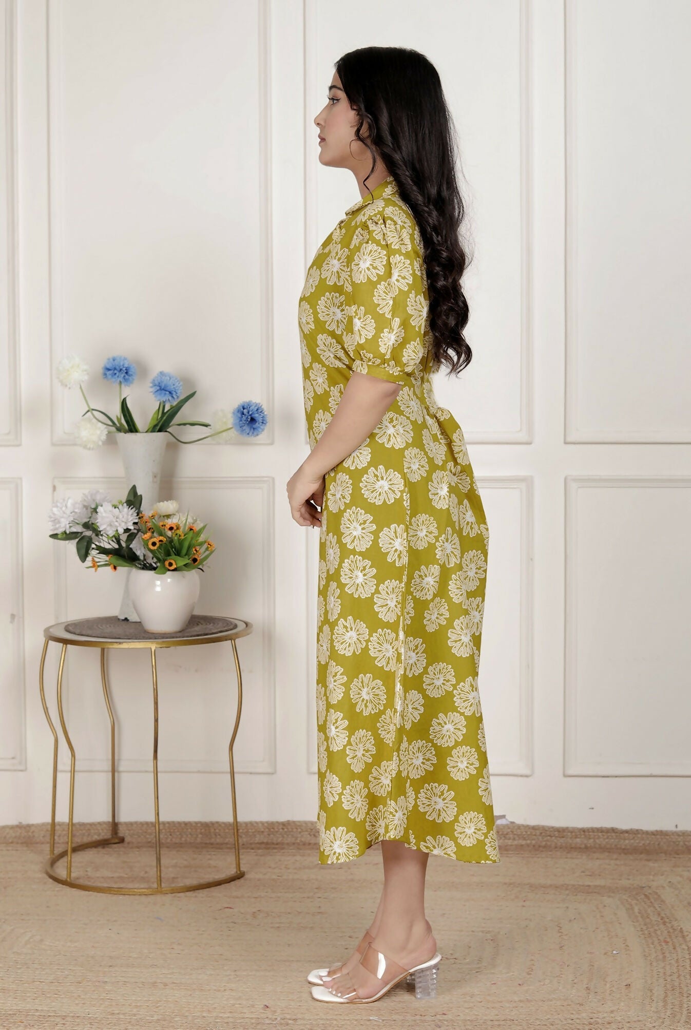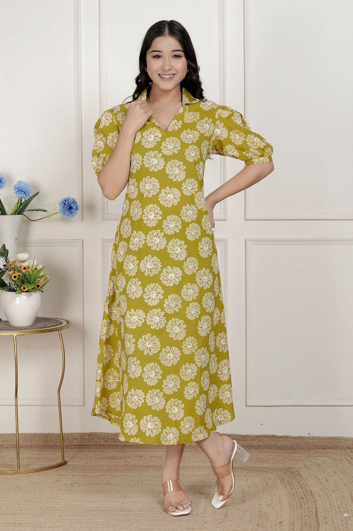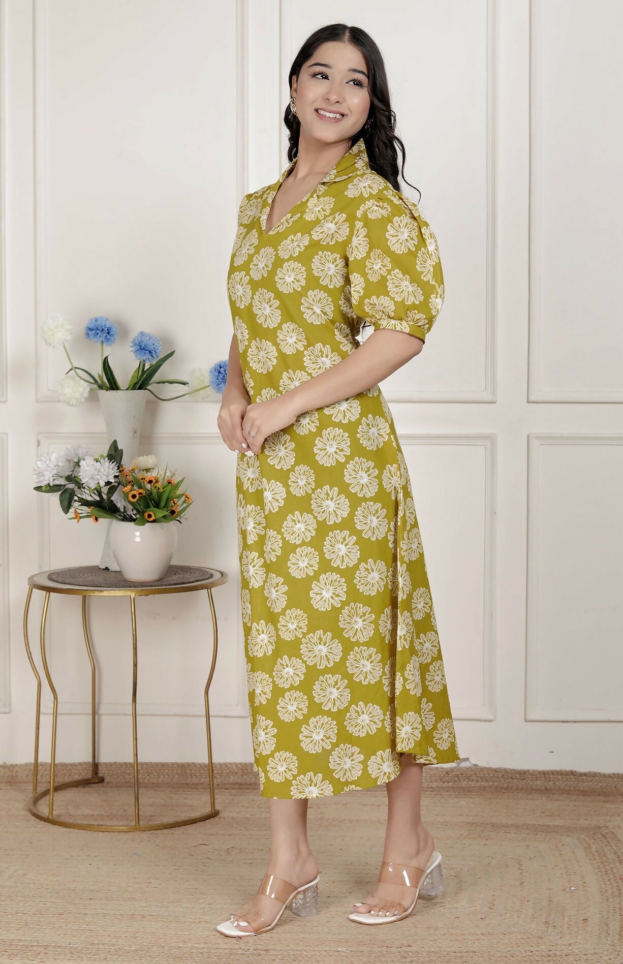Miravan Women'S Yellow Printed Puff Sleeve Floral Maxi Party Dress