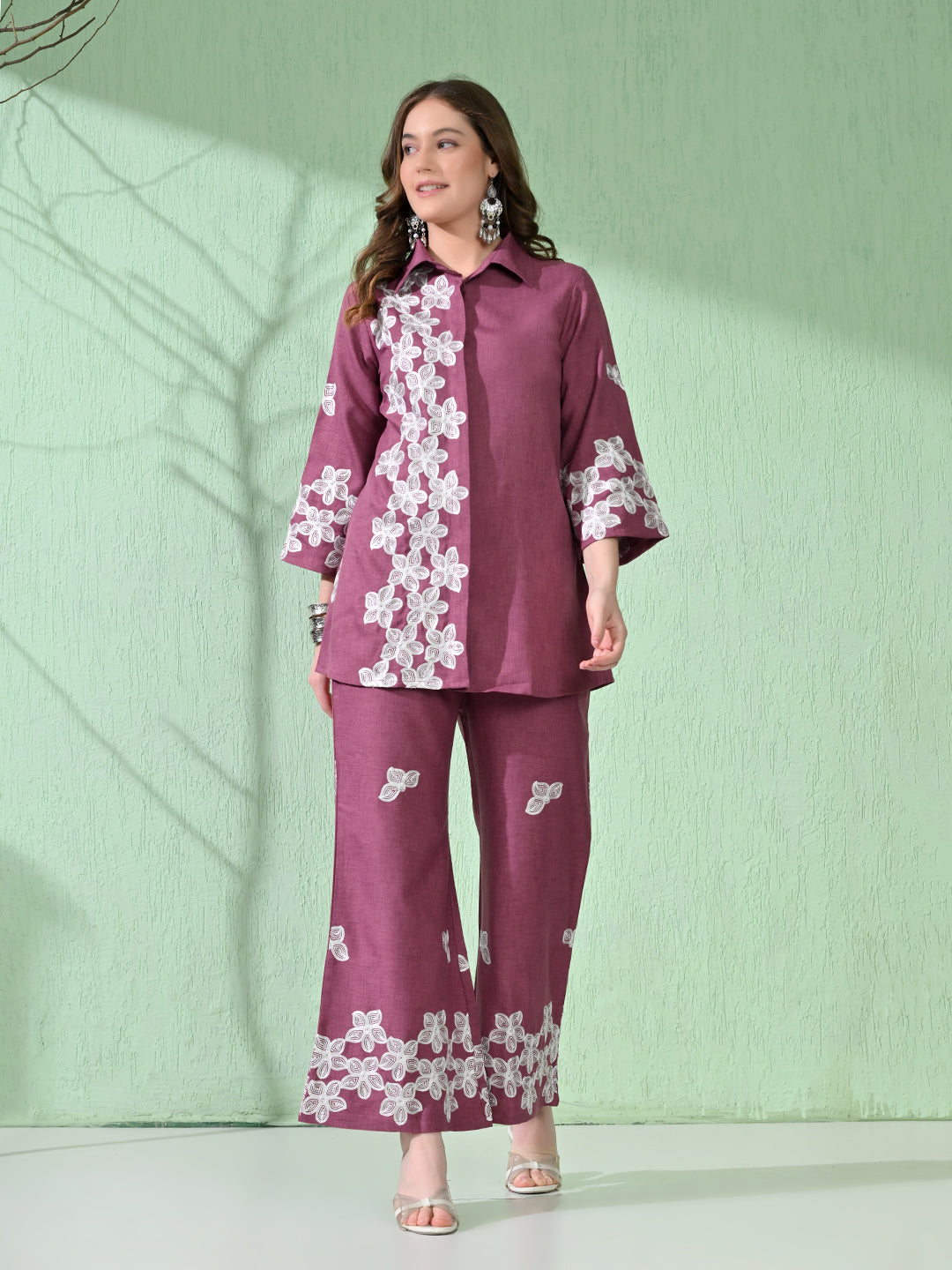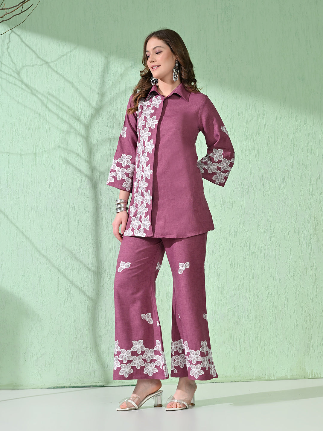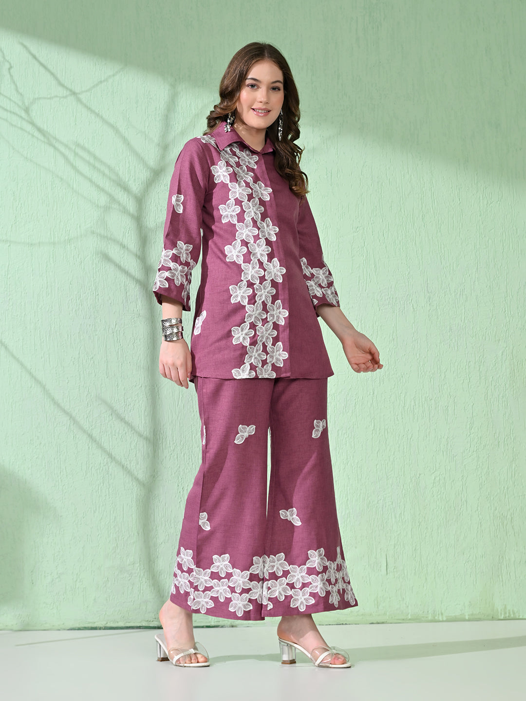 Myshka Women's Floral Embroidered Pink Tunic with Trouser