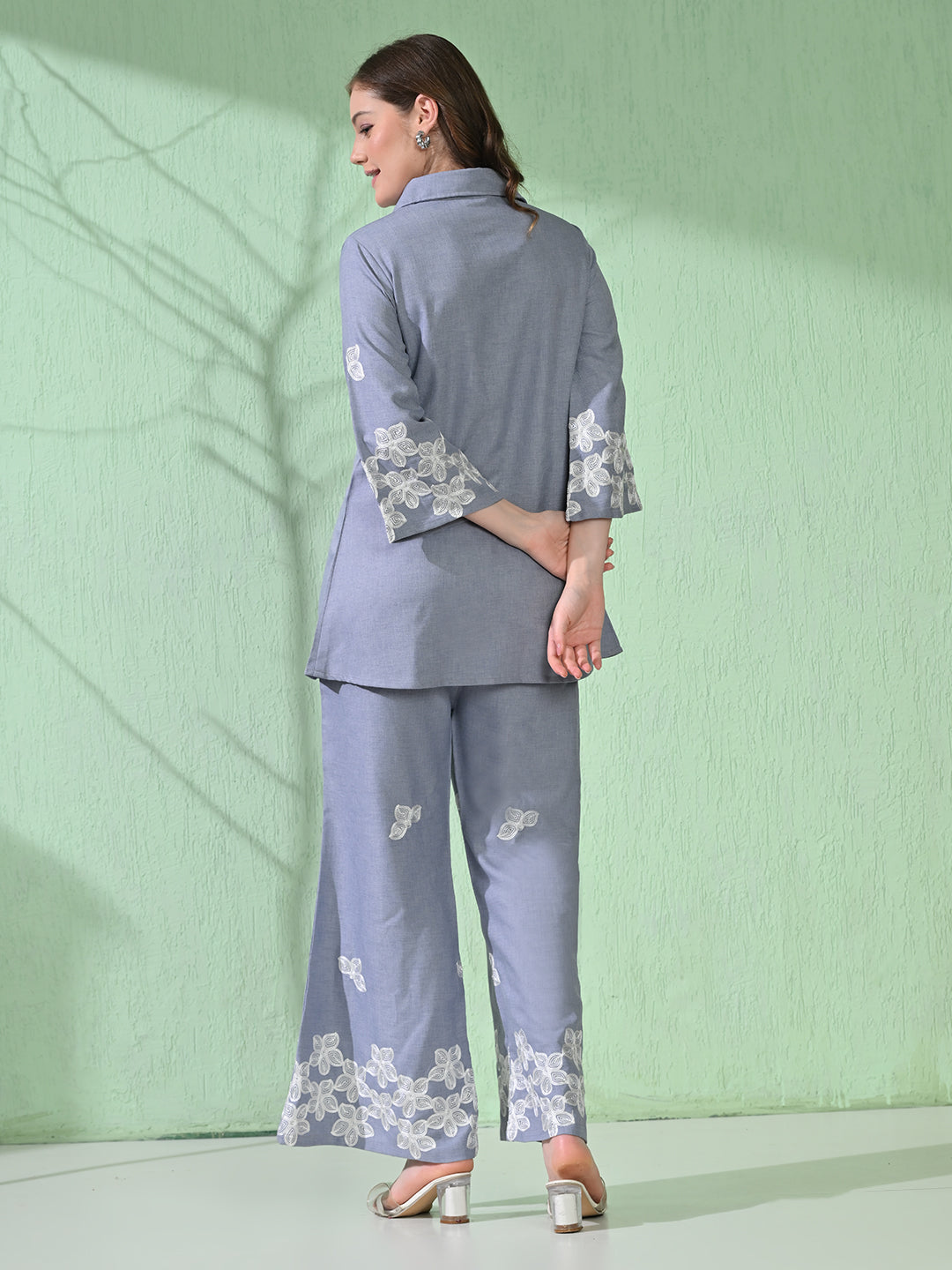 Myshka Women's Floral Embroidered SkyBlue Tunic with Trouser