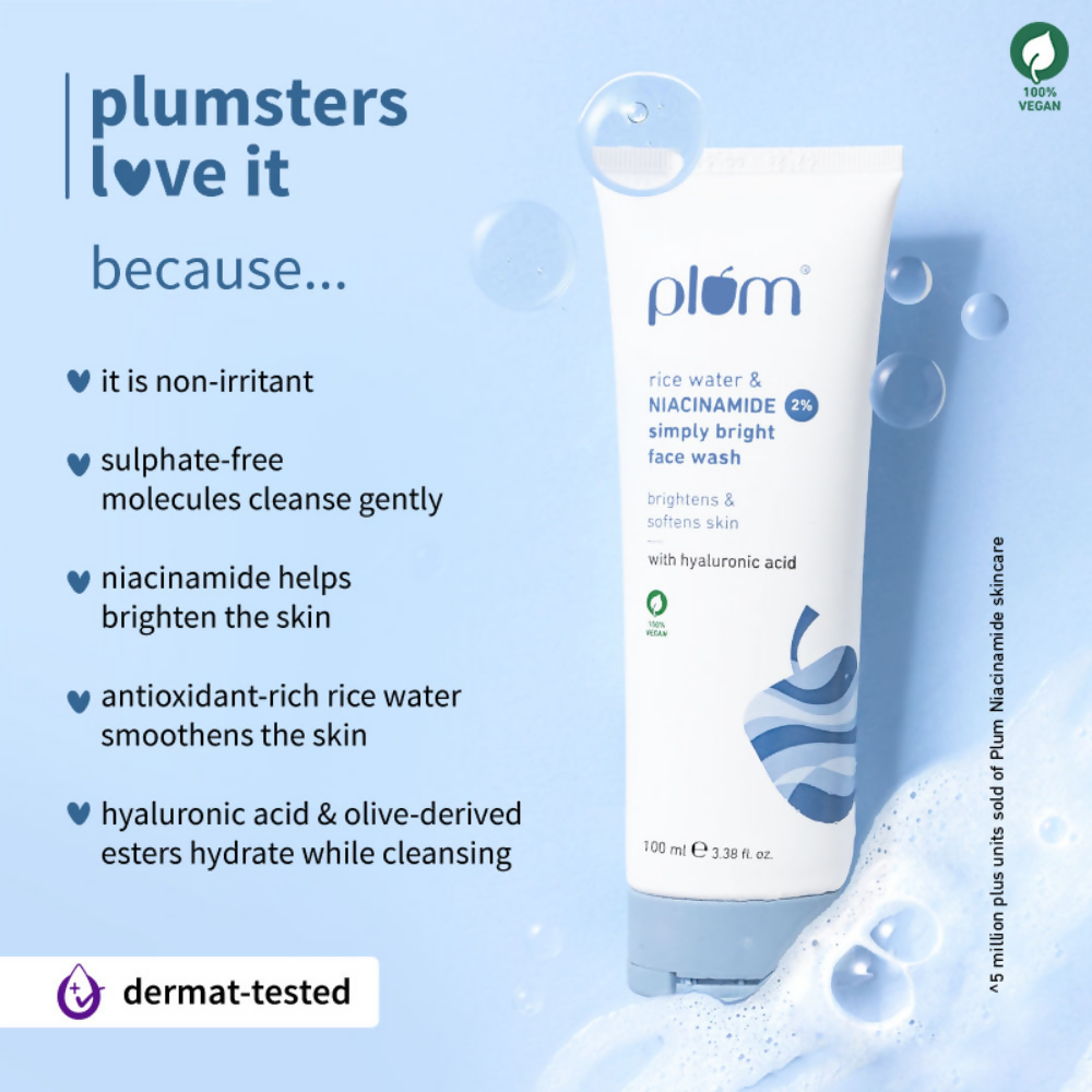 Step into the bright side with Plum 2% Niacinamide & Rice Water Simply Bright Face Wash. The dynamic duo of 2% Niacinamide and Rice Water work diligently to brighten, clear and smoothen your skin. Its gentle, non-drying and sulphate-free formula ensures your skin stays soft and supple after every wash.