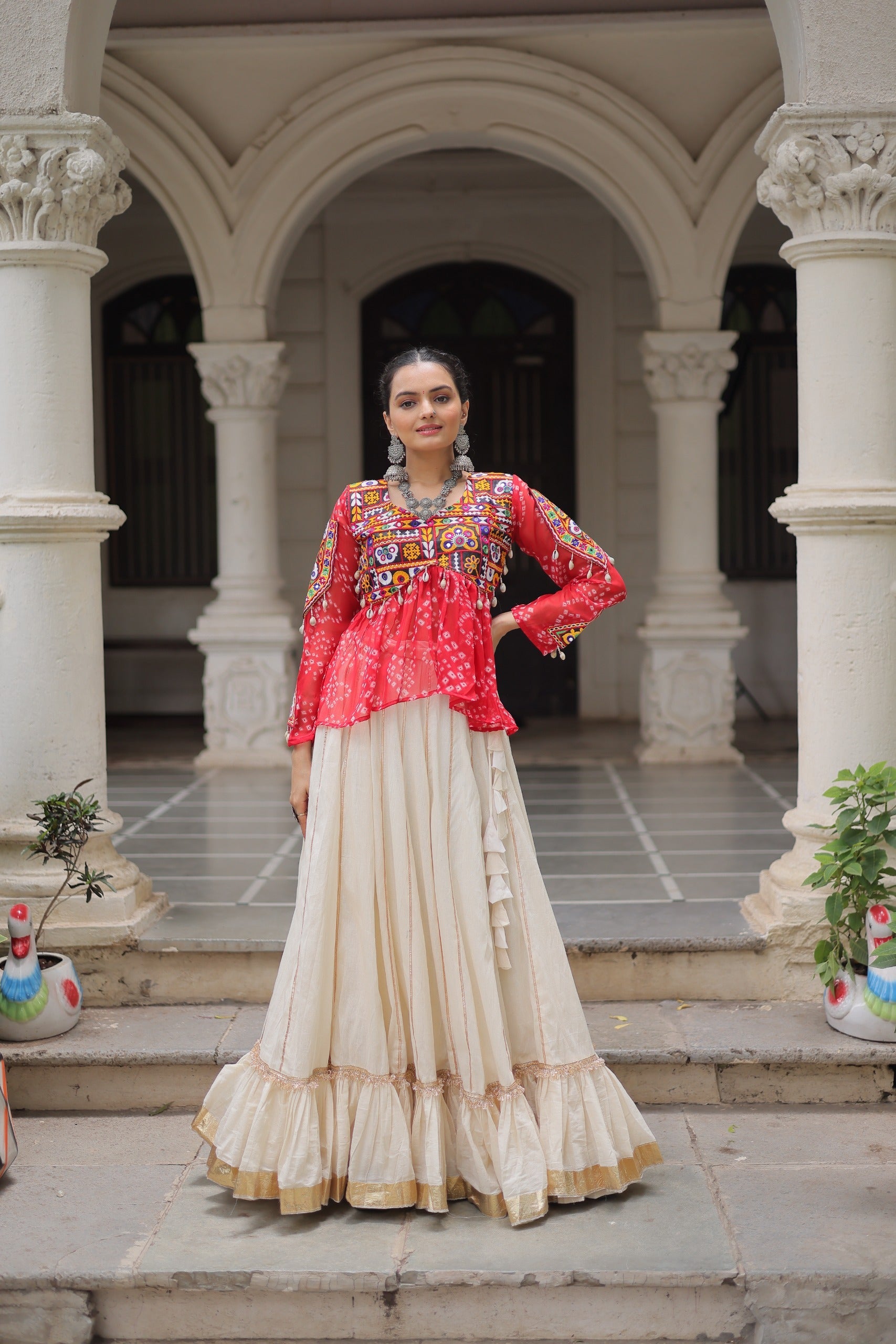 Prazu Fashion Red Georgette Bandhani Print With Kutchi Gamthi Navratri Lehenga