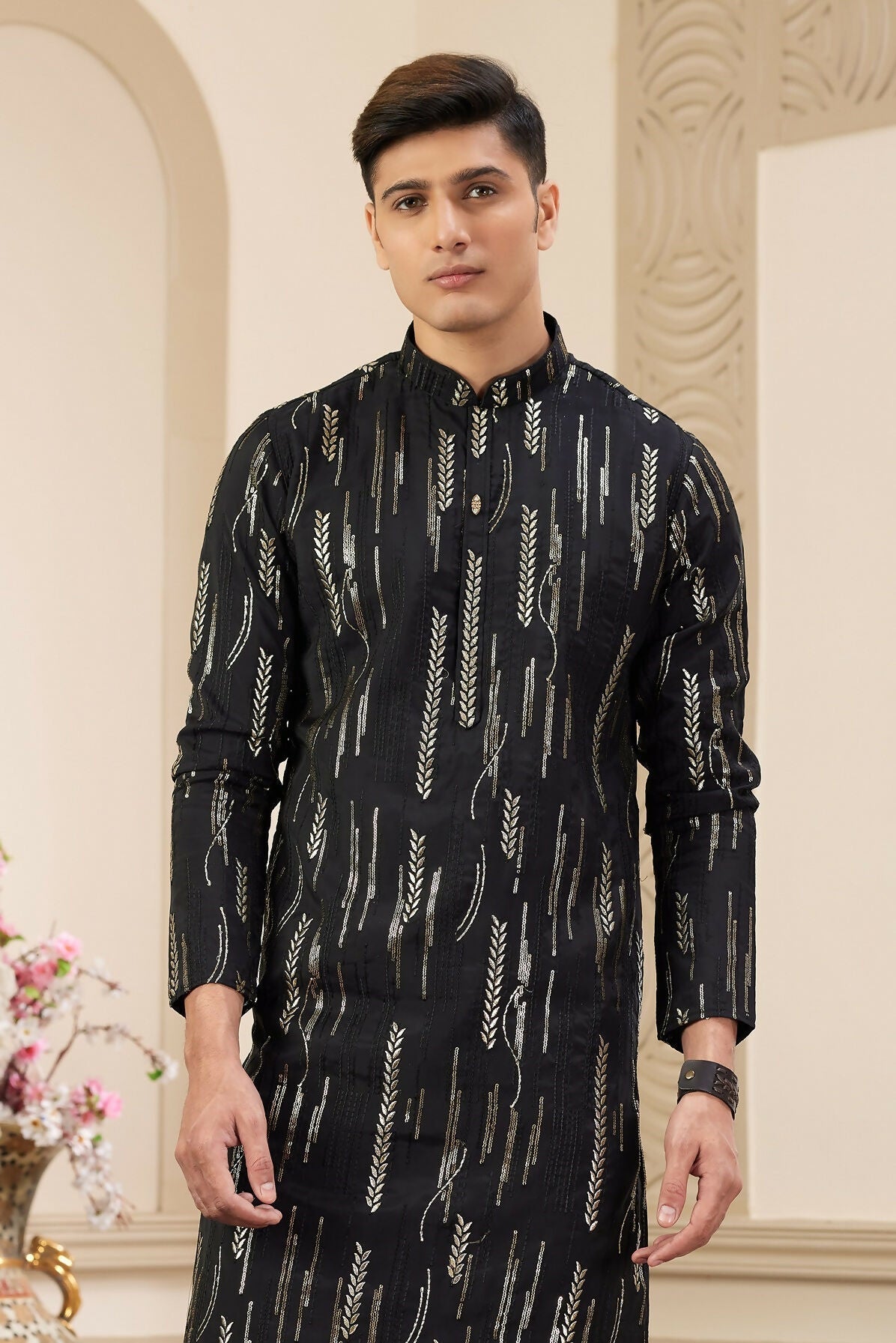 Raivat Ethnic Men's Art Silk Thread Work Kurta Pyjama In Black Colour