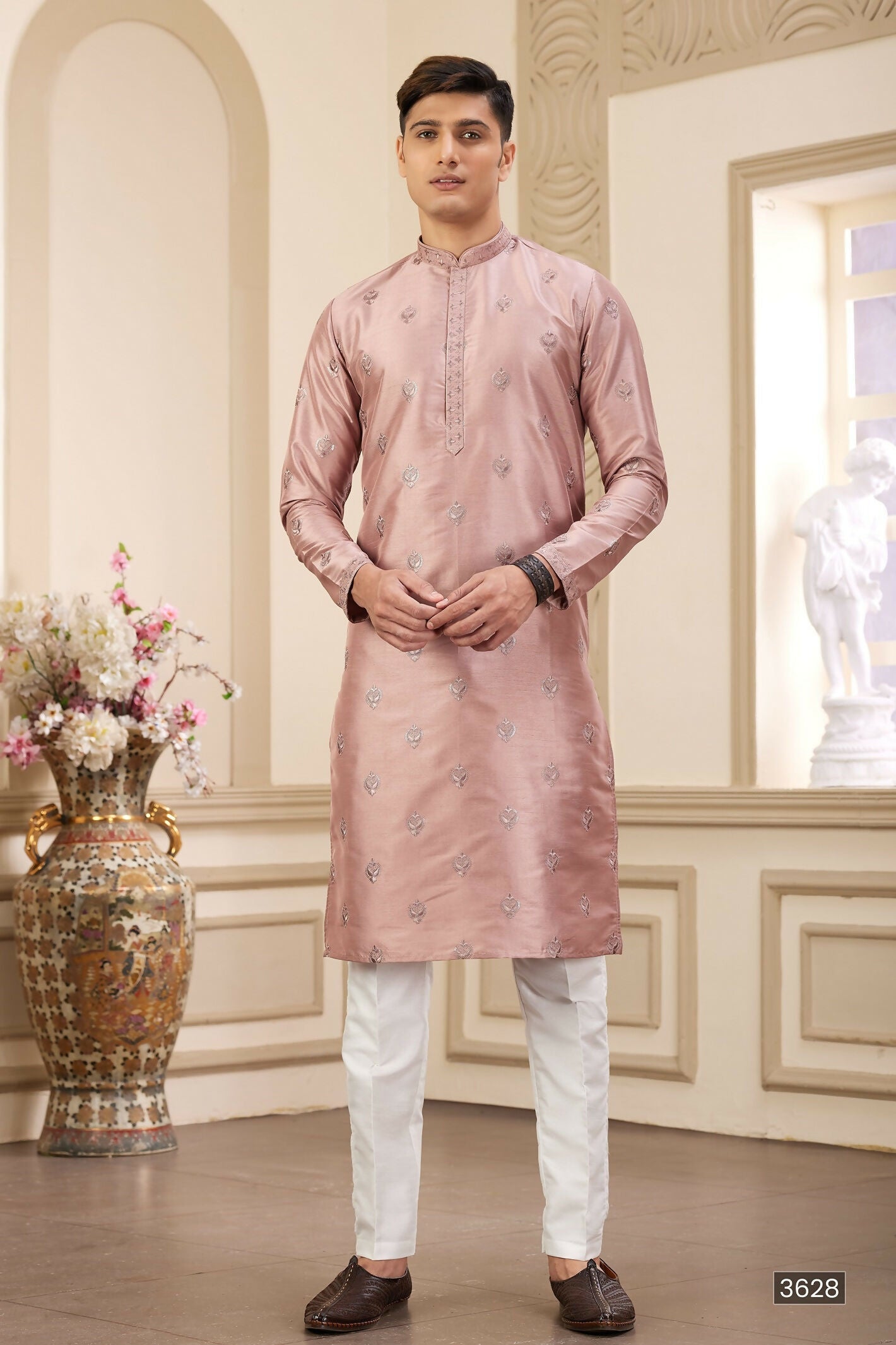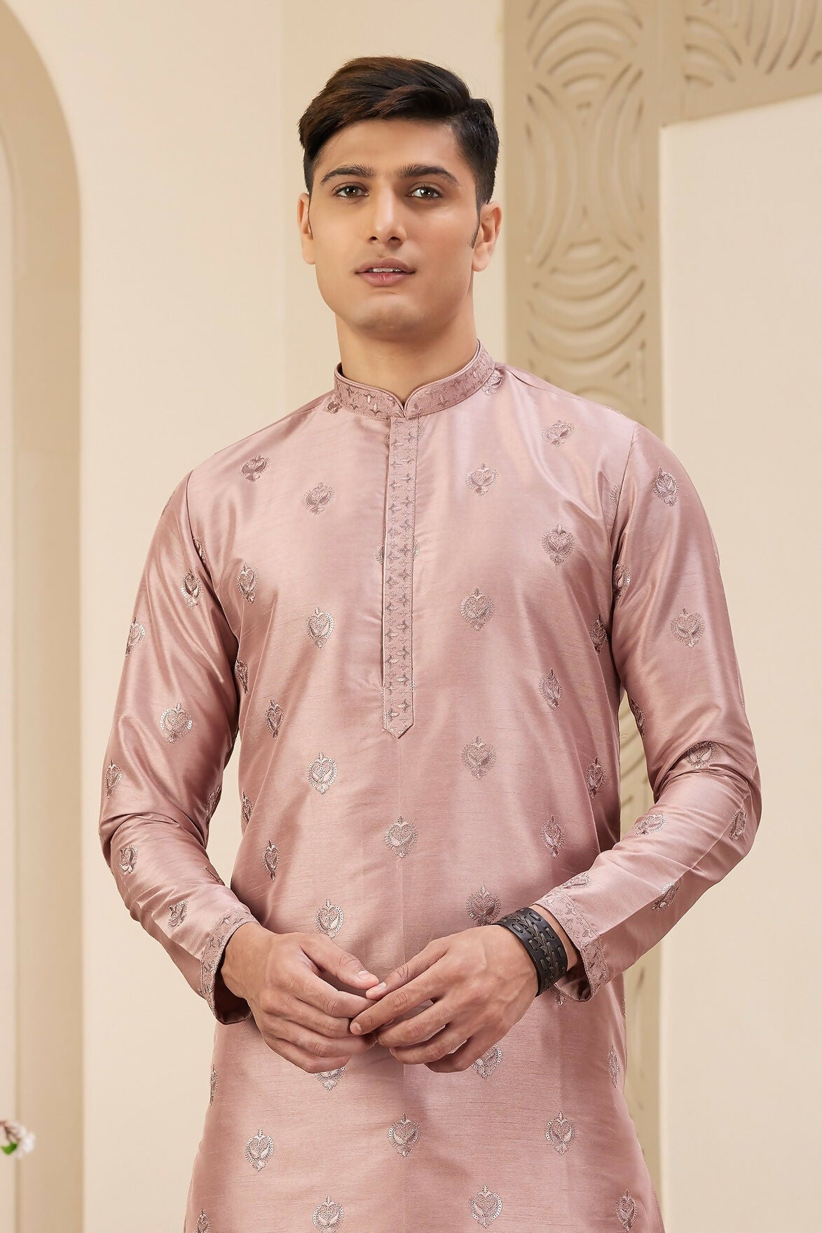 Raivat Ethnic Men's Art Silk Thread Work Kurta Pyjama In Cream Beige Colour